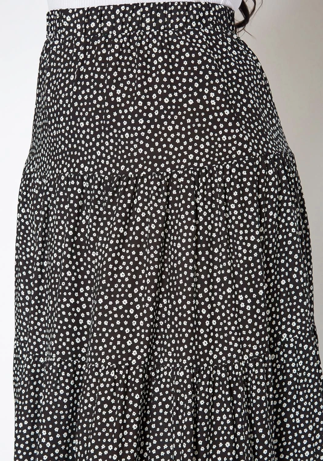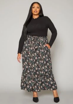 Lovely maxi skirt for plus size women in dainty floral print, high waist style, tiered design and wide flare.