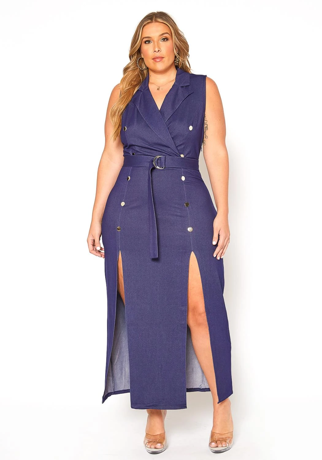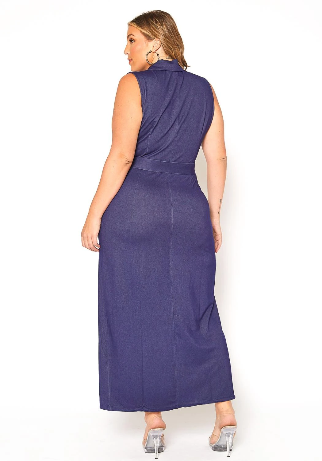 Plus size women’s sleeveless denim maxi dress featuring a collar style, double sided slits and detail faux buttons. Includes waist denim D-ring belt.
