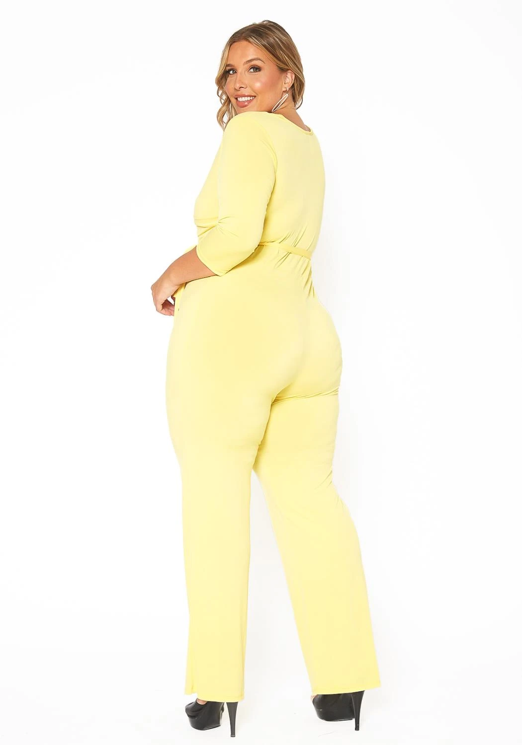 Keep it elegant in our sincere plus size women’s jumpsuit. Features an overlay surplice, 3/4 long sleeves, flare leg style and includes a matching waist tie.