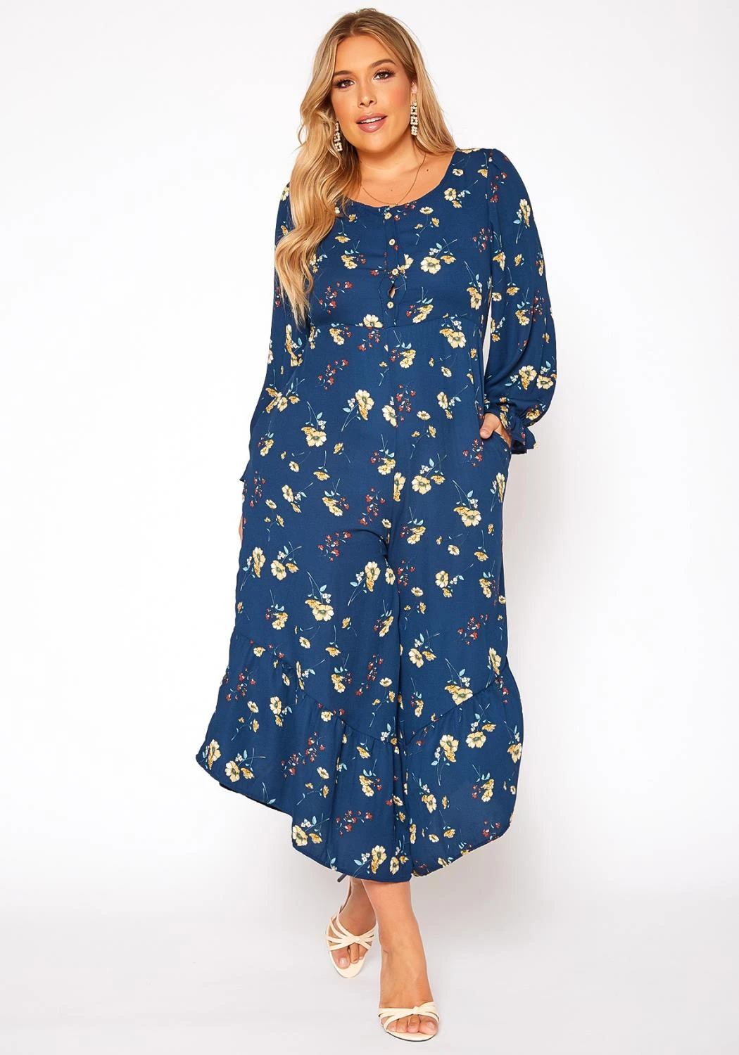 Fresh plus size women’s floral print jumpsuit in round neck style, button front hem, loose long sleeves, elastic flare wrist cuffs and wide flare leg hem.