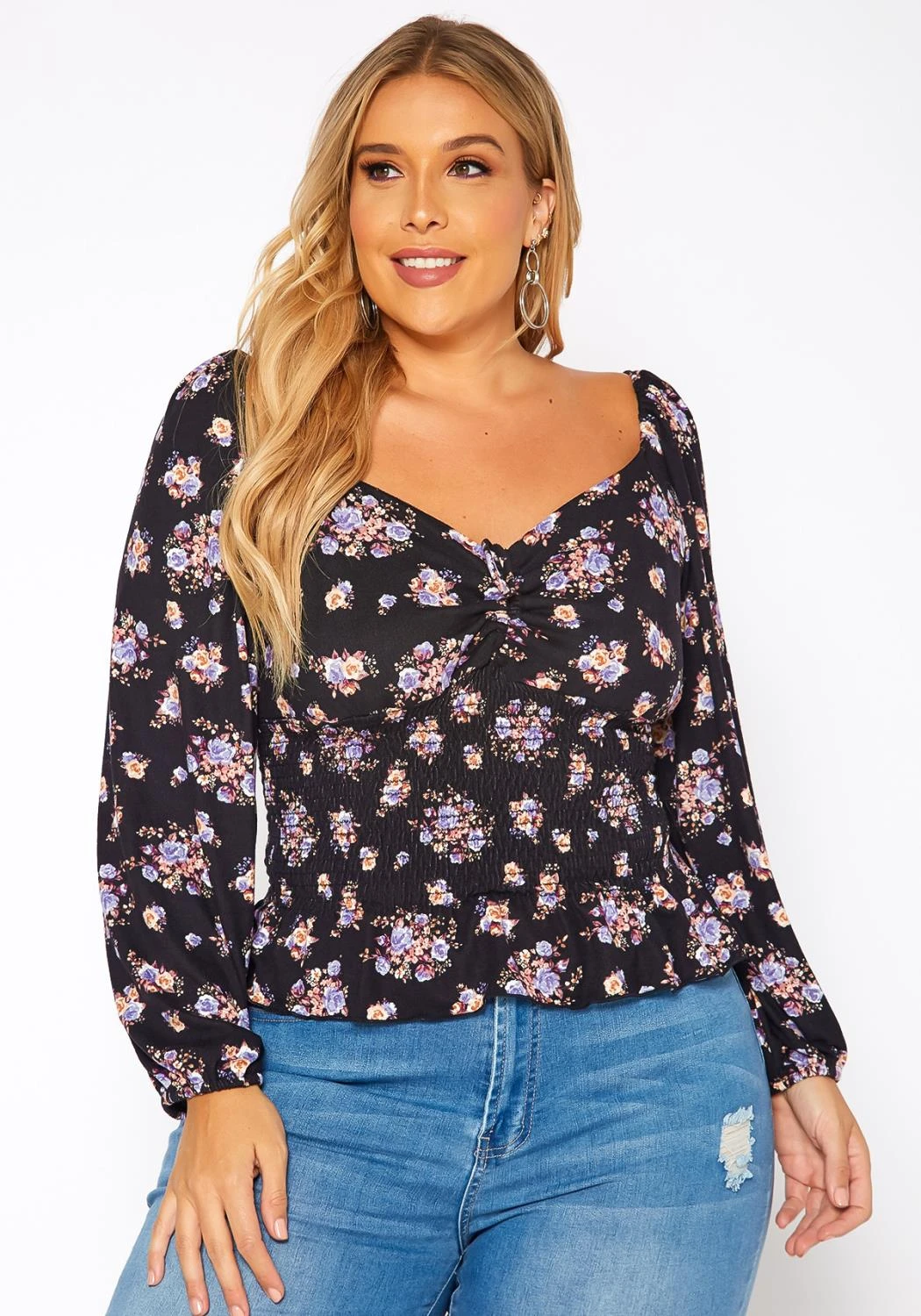 Sweet plus size women’s floral print top in sweetheart v-neck style, long sleeves with elastic wrist cuffs, centered drawstring bow-tie, smocked waist hem and flared end. Material is incredibly soft and comfotable.