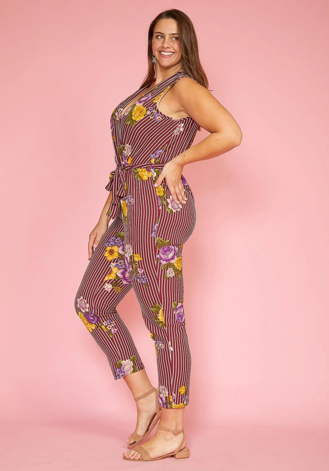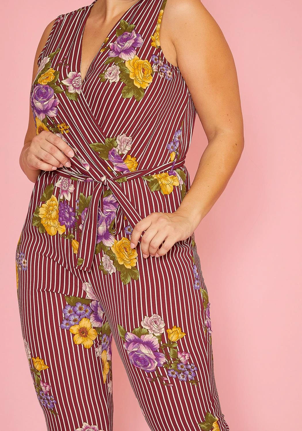 Fused with both stripe and floral patterns and even has a waist tie belt to accentuate the waist line.