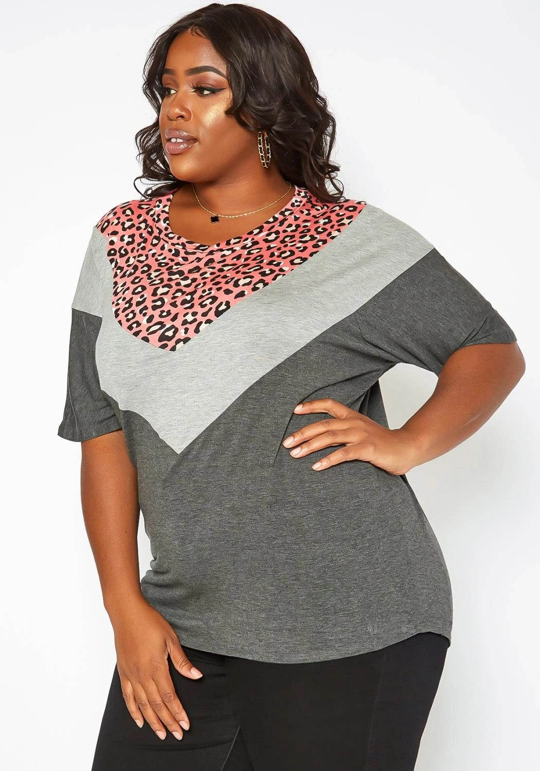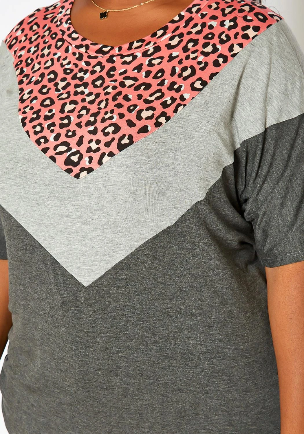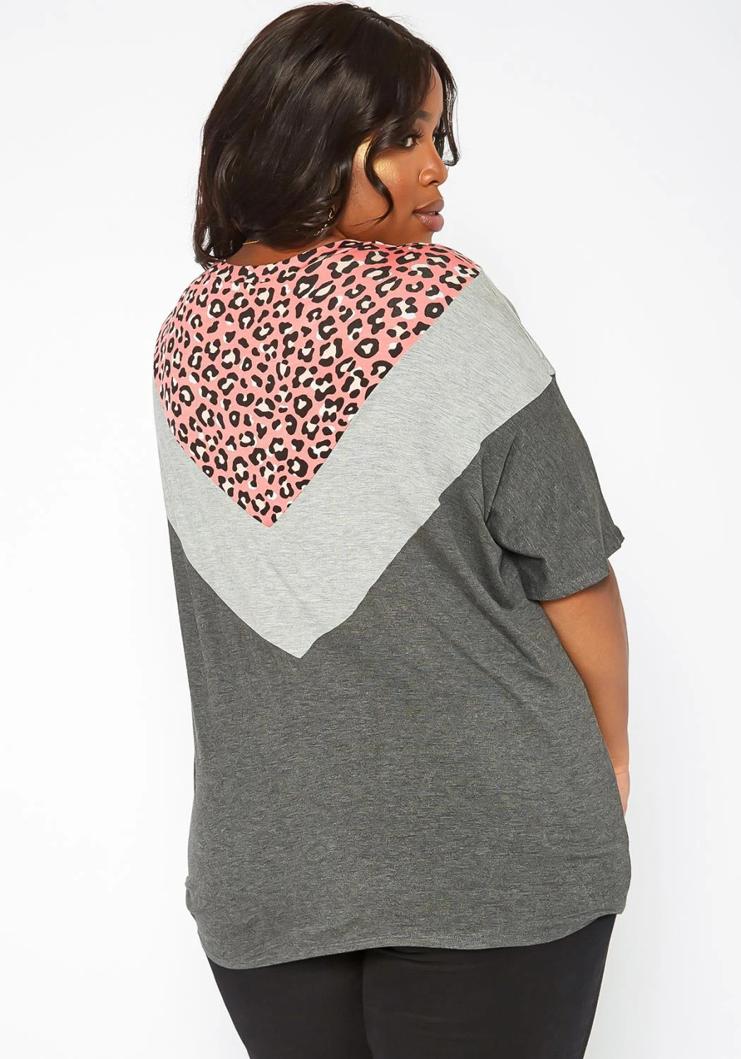 Casual plus size women’s t-shirt with pink leopard print design, chevron splice design, v-neck style, hip length and dolman short sleeves.