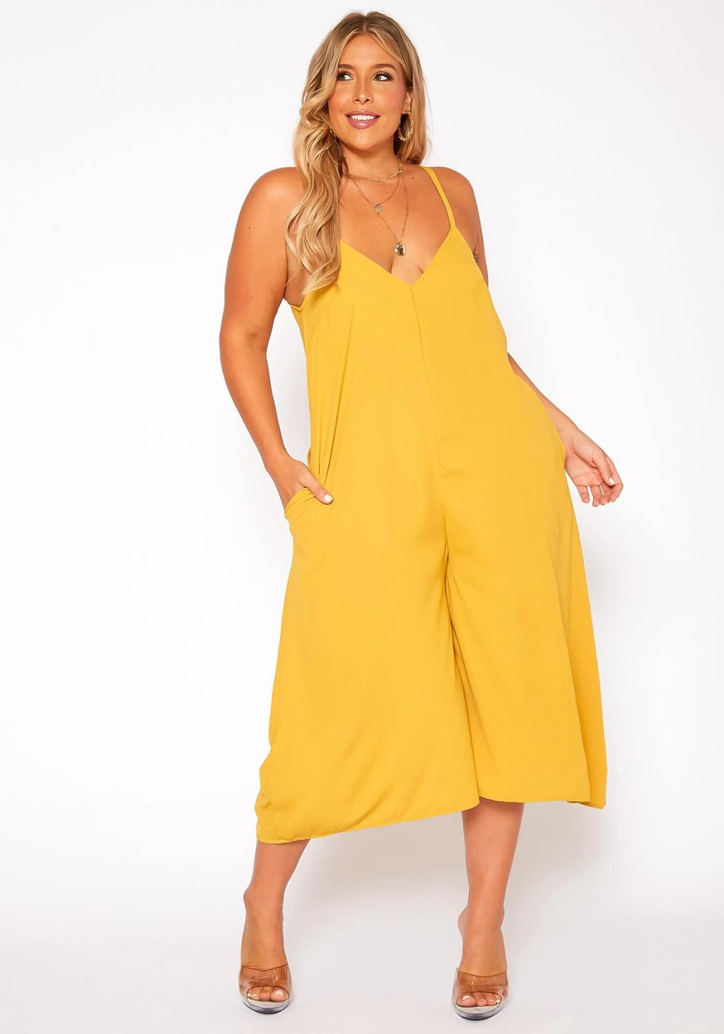 Plus size women’s basic jumpsuit in relaxed fitting, adjustable cami shoulder straps, v-neck style, pocket ascent and wide flare leg hem.