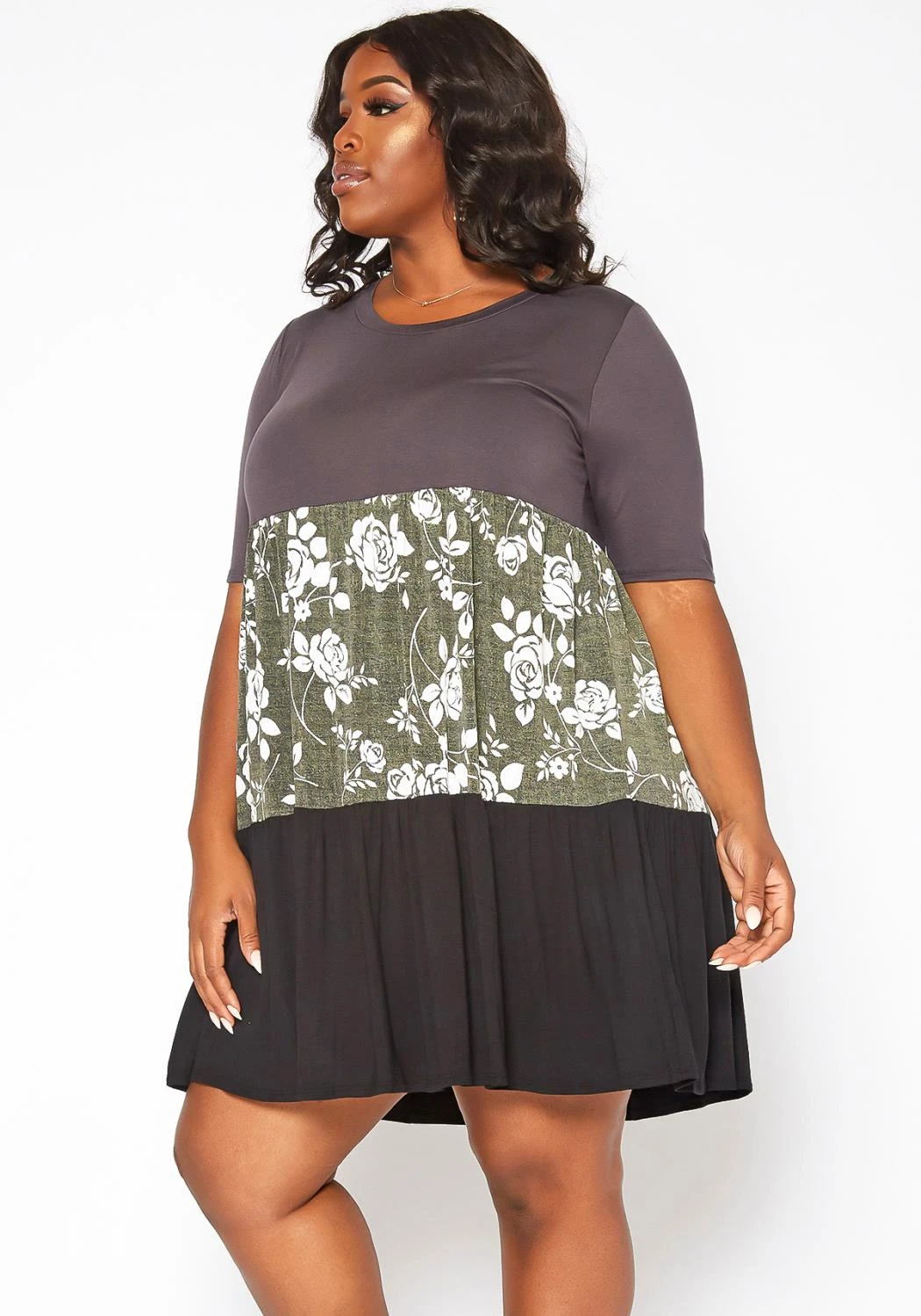 Simple plus size women’s mini dress in color block design, round neck style and fitted short sleeves.