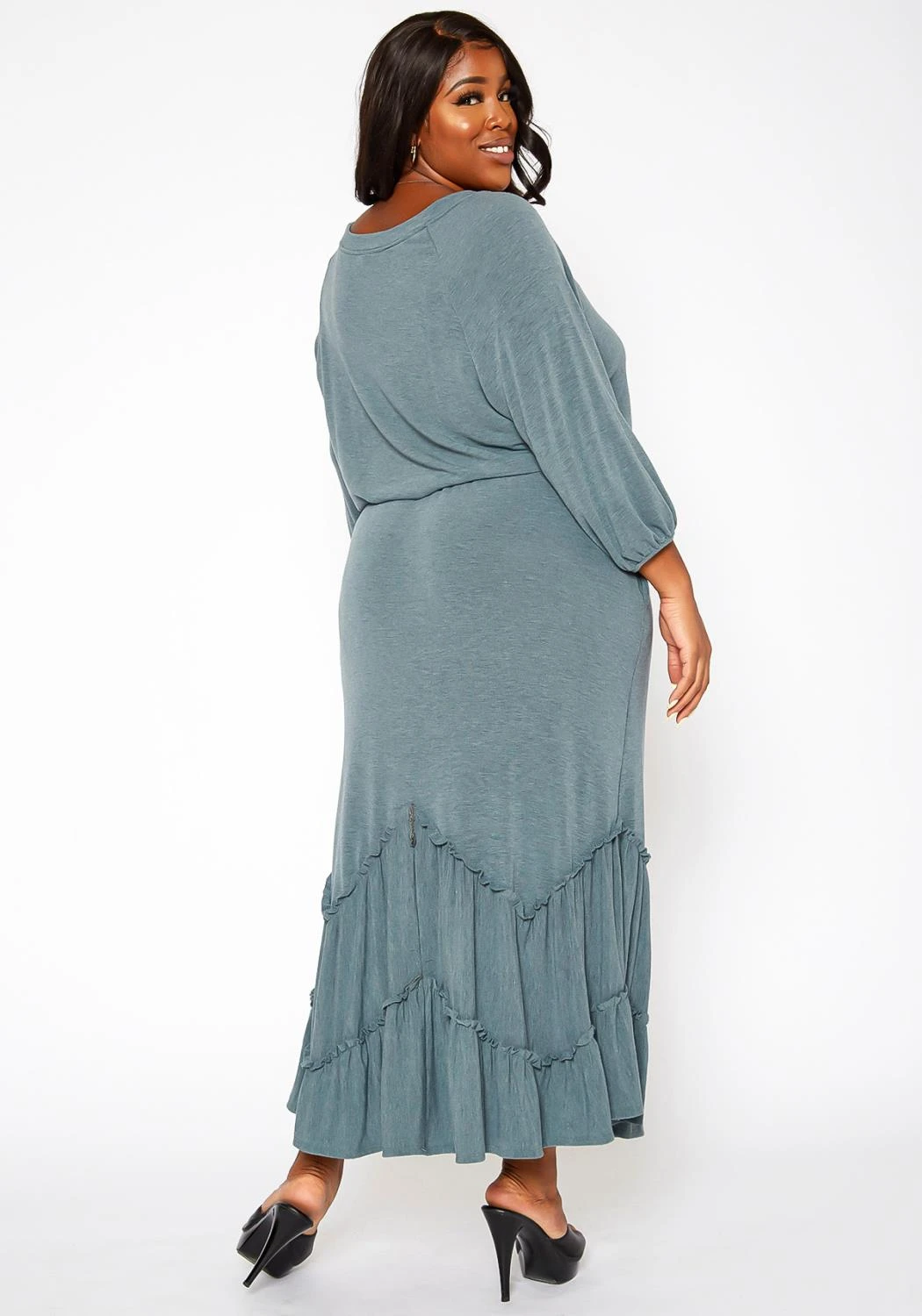Effortless plus size women’s knit maxi skirt in high waist style, pocket hem, ruffle trim details and flare design.