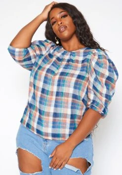 Lovely summer top in multi color tartan plaid print, crew neck style, half puff sleeves and back neck button closure.
