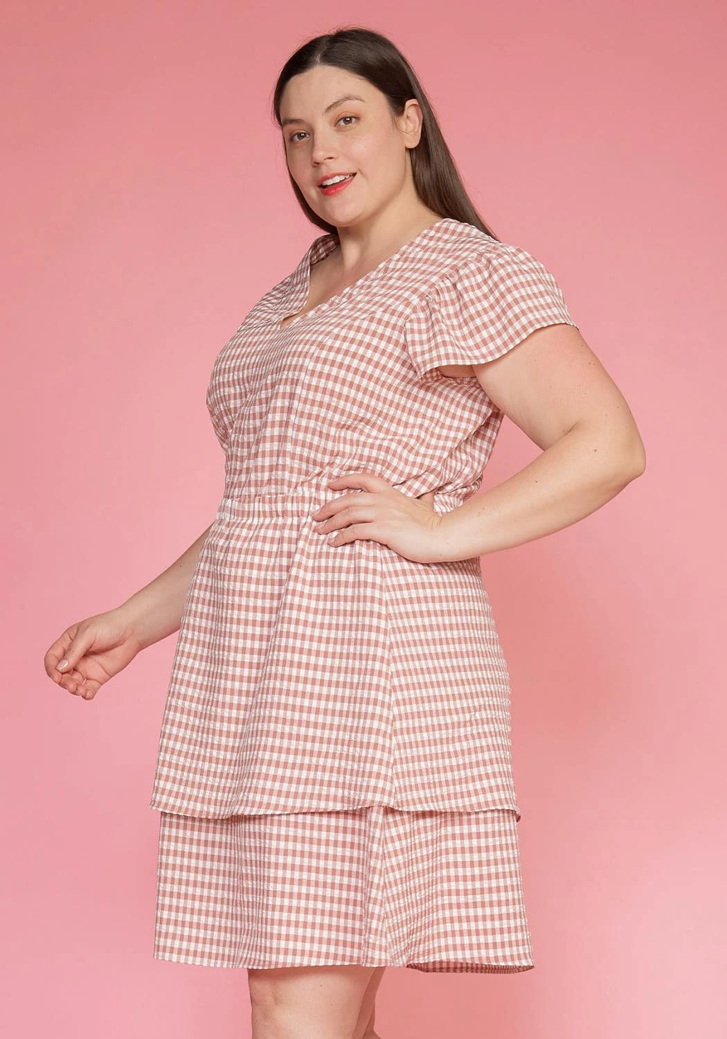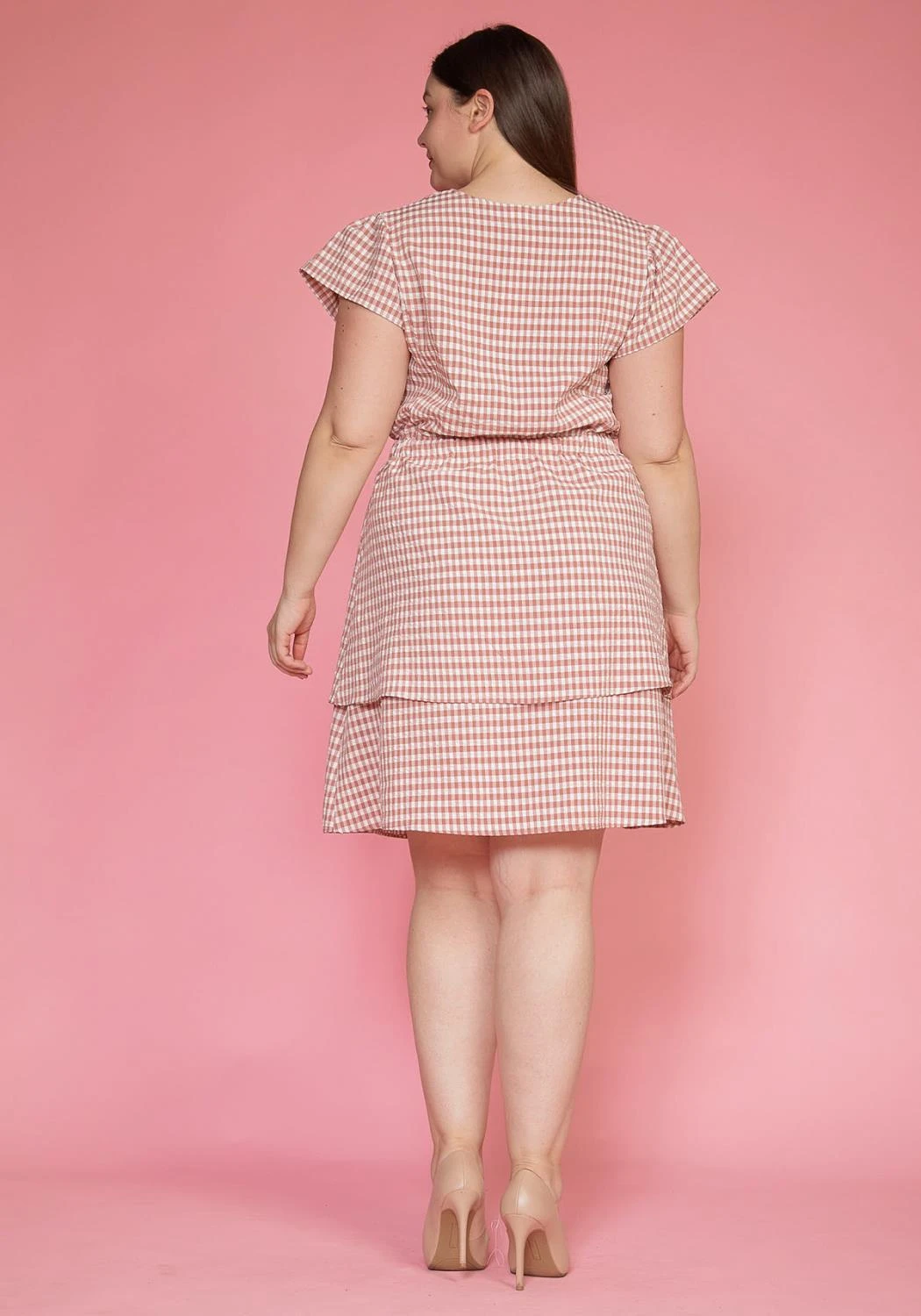 Pleione Plus Size Puff Shoulder Ruffle Checkered Dress
