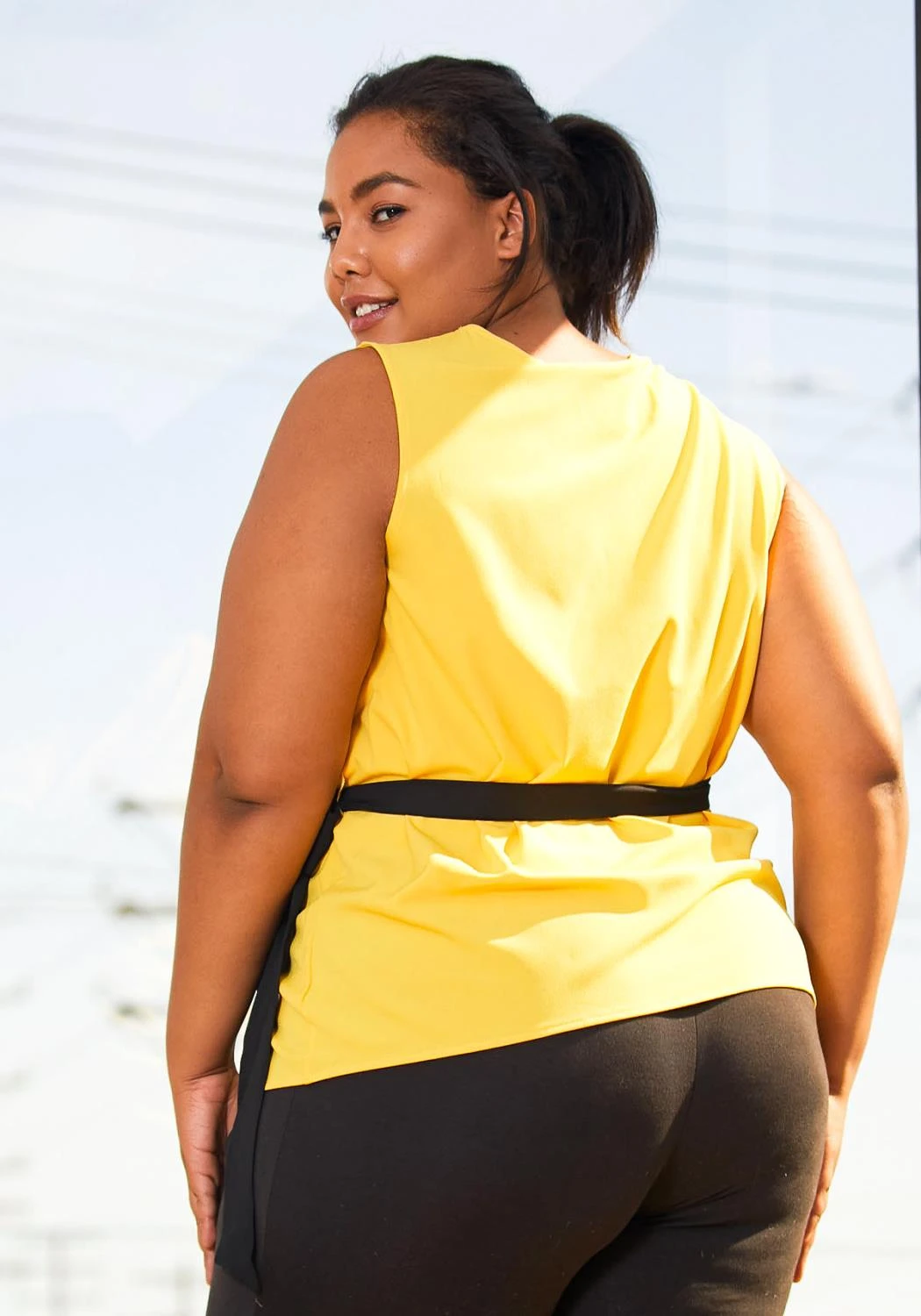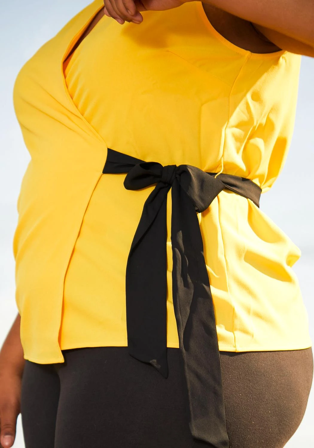 Pleione’s semi-fitted womens yellow wrap blouse in sleeveless style featuring a side wrap knot adjustable to your fitting preferences.