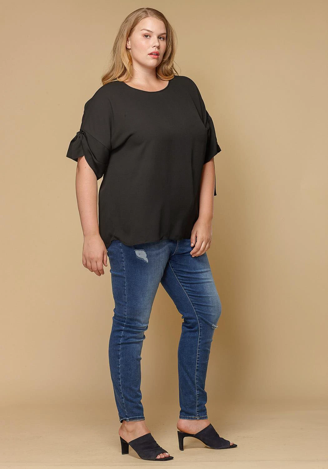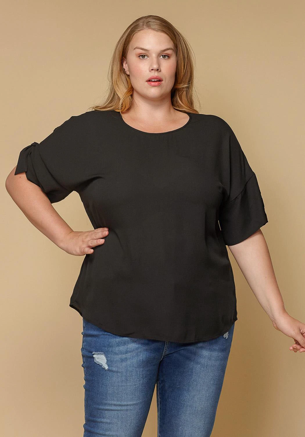 Girly round neck self-tie short sleeve top plus size women clothing
