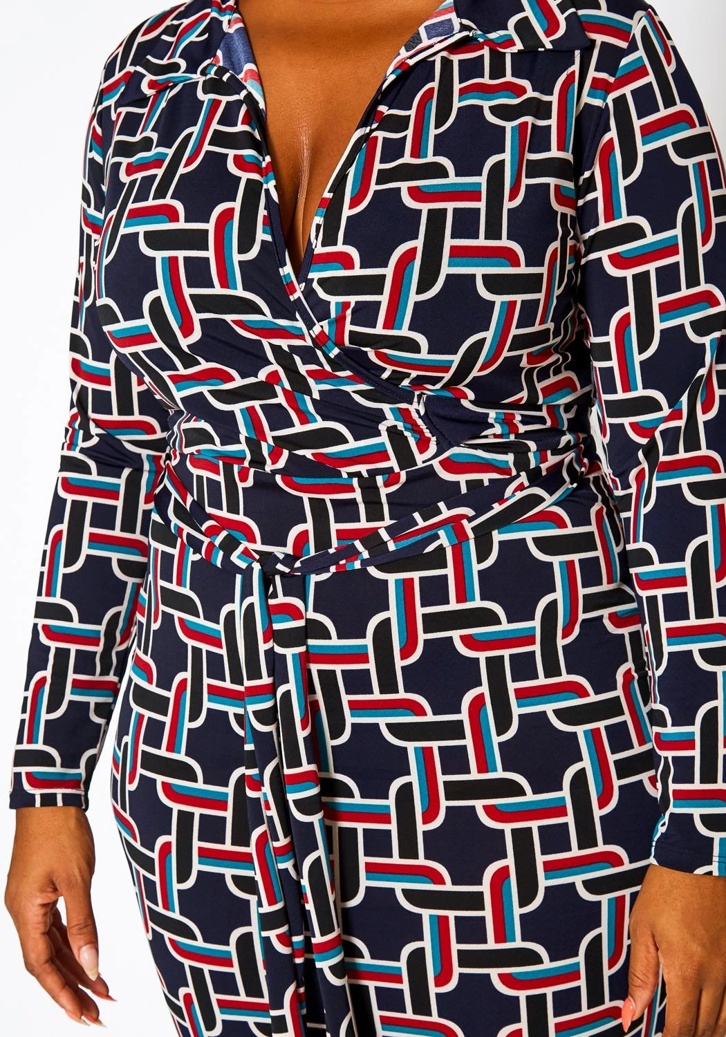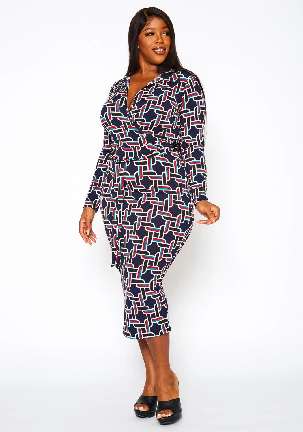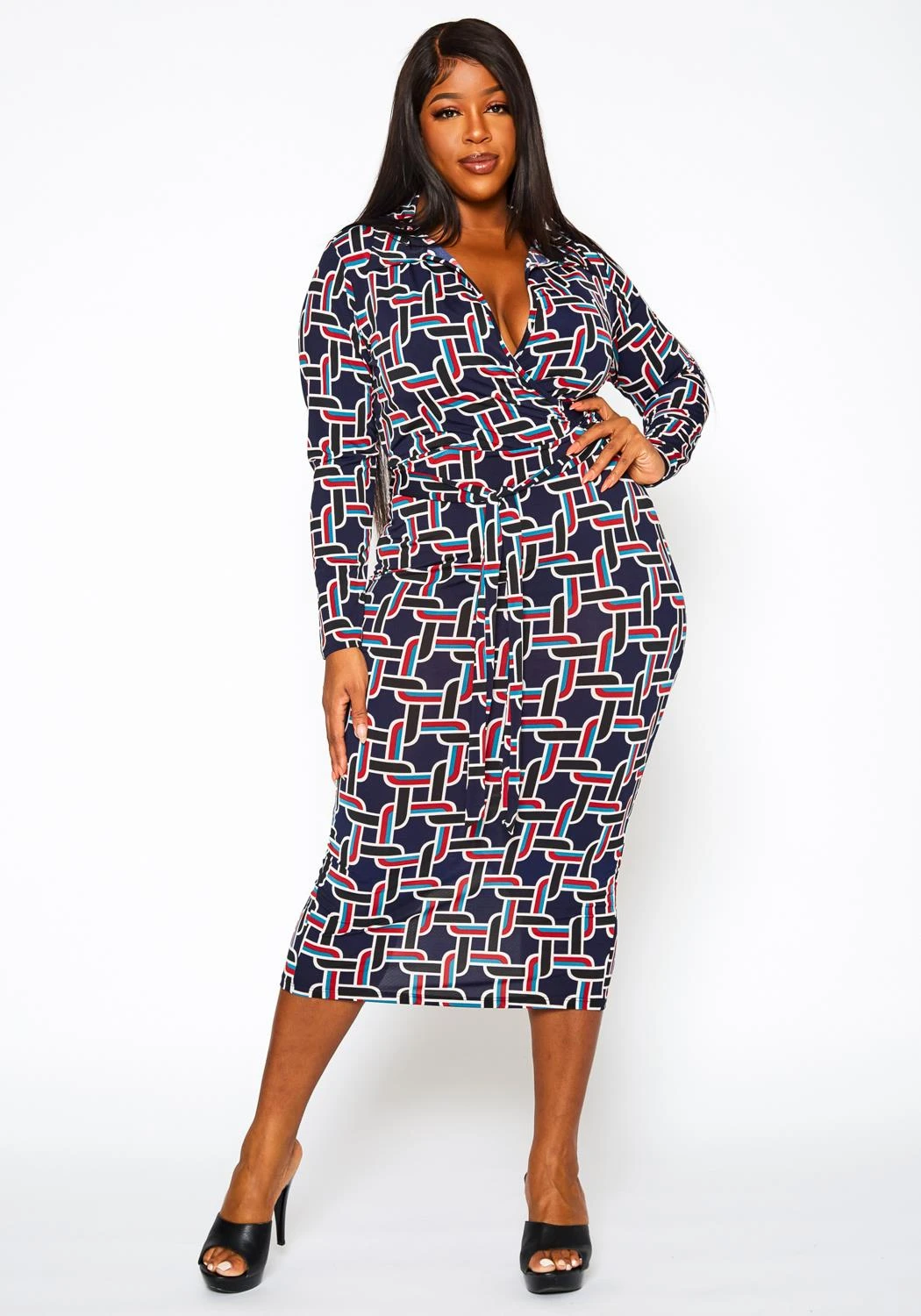 Lovely plus size women’s midi dress in abstract pattern, bodycon midi fit, fitted long sleeves, collar neck style, v-neck front and waist tie hem.