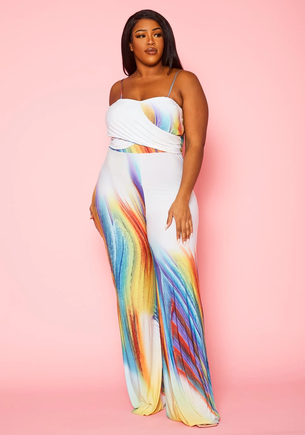 Beautiful plus size women’s jumpsuit in abstract pattern, flare leg hem, cami shoulder straps and overlay hem.