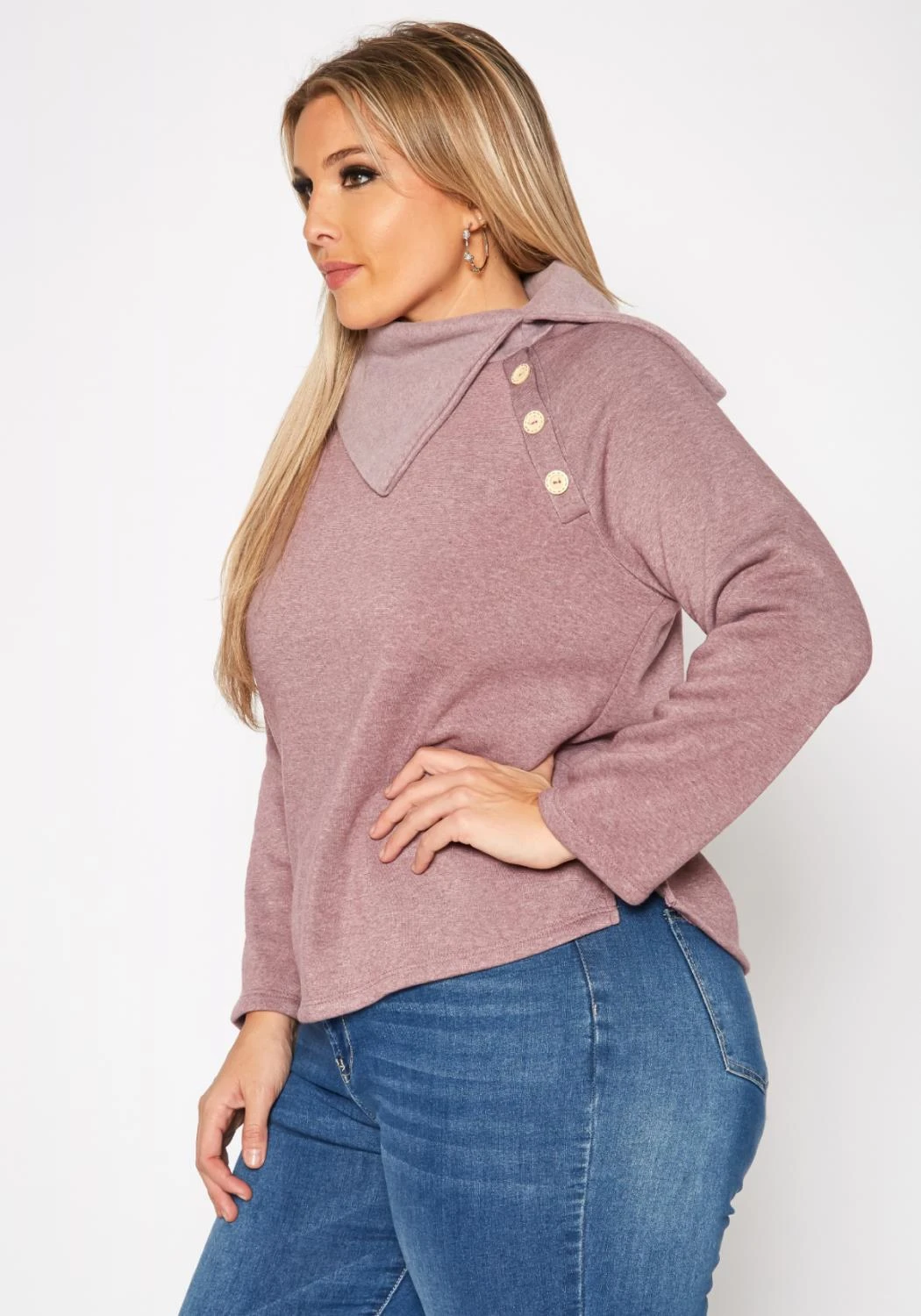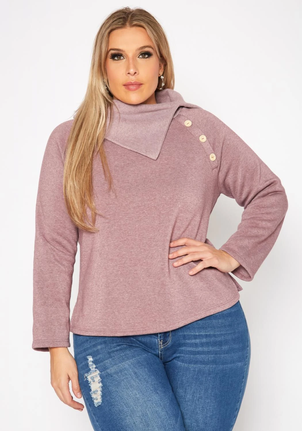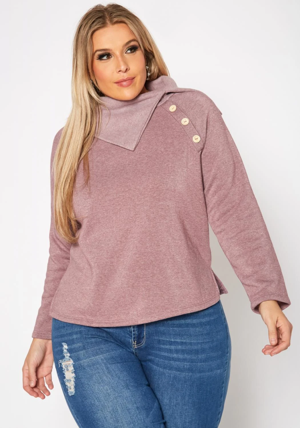 Plus size women’s casual sweater with asymmetric collar neck, long sleeves and button front hem.