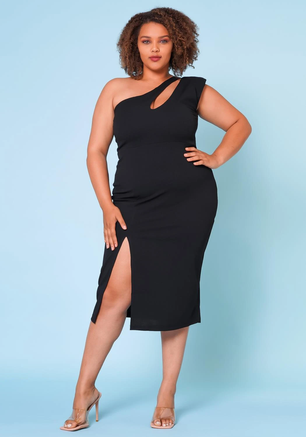 Make an impression in this plus size women’s cocktail midi dress which features an asymmetric one sleeve design, slit hem details and back zipper closure.