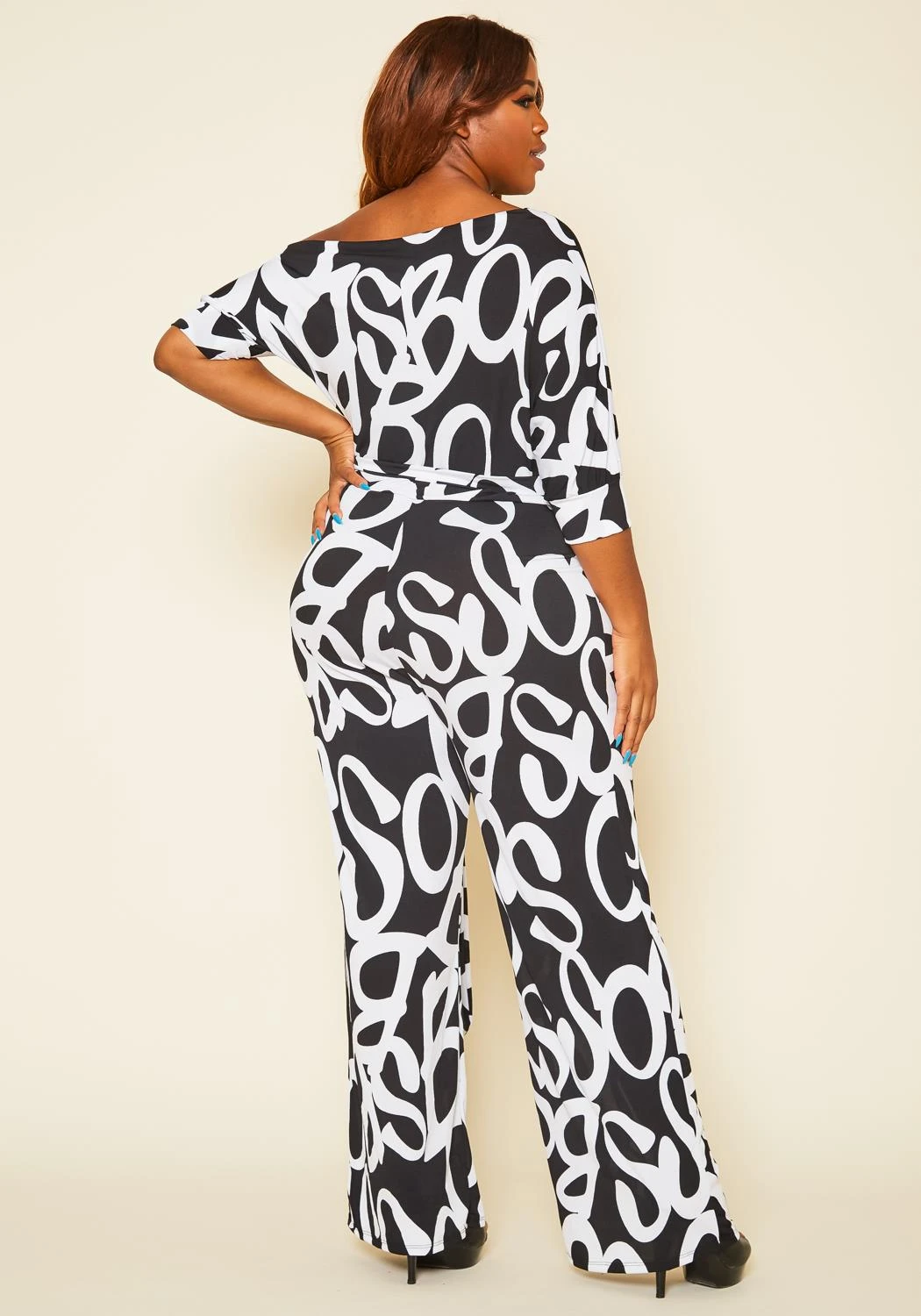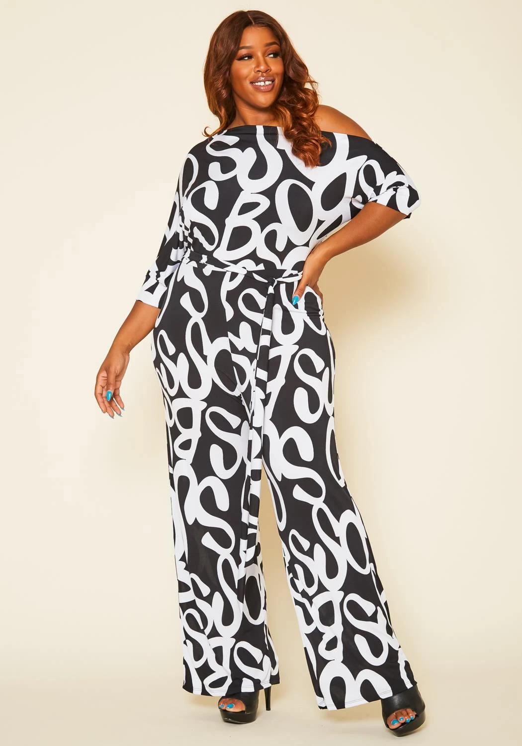 Plus size women’s jumpsuit featuring a asymmetric shoulder hem, multicolor print, elbow sleeves, detachable waist tie and wide flare bottoms.