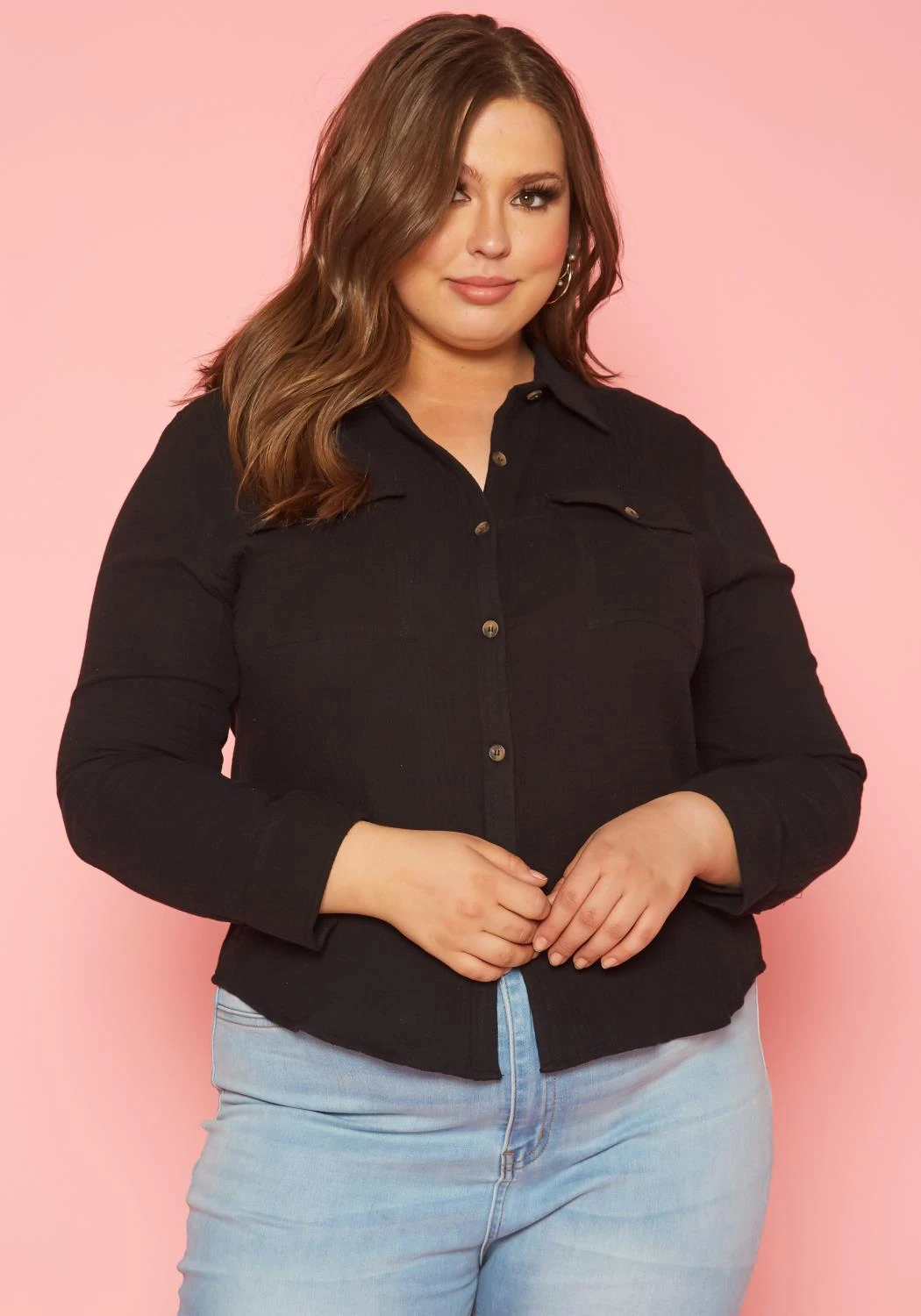 Casual plus size women’s shirt in collar neck style, button front closure, pocket details, long sleeves and buttoned wrist cuffs.