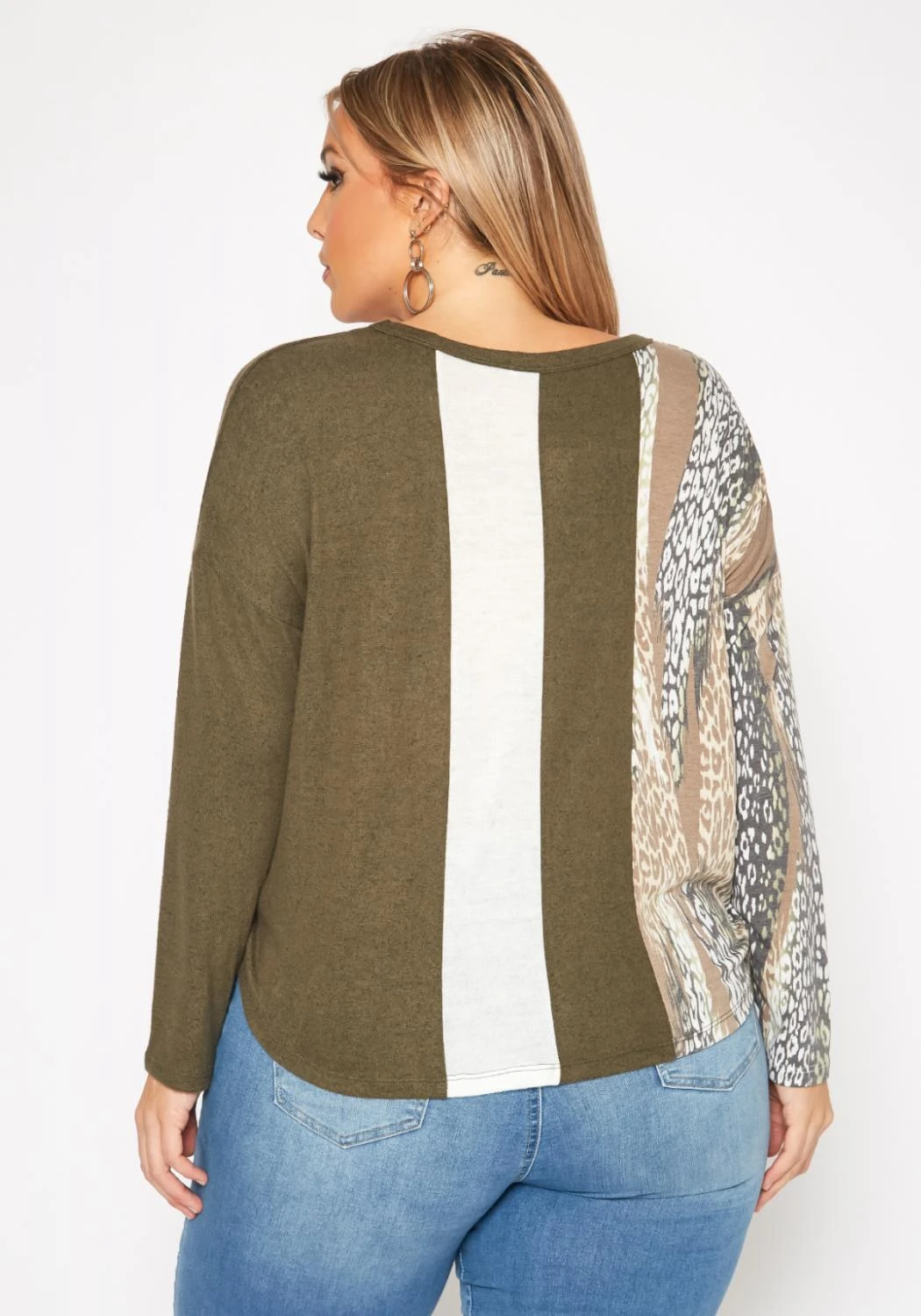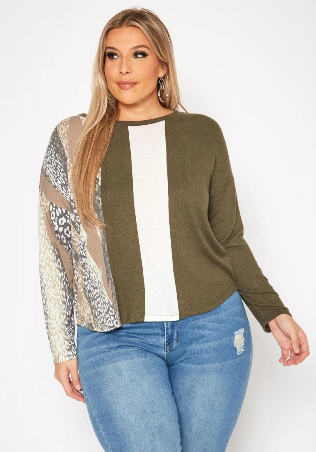 Plus size women’s casual sweater in leopard pattern, color block, long sleeves and round neck style.