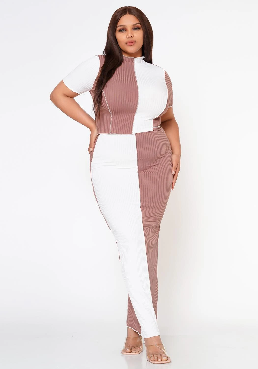 Plus size women’s matching set which features a color block design short sleeve crop top and high waist pencil maxi skirt. It has ribbed stretchy material that comfortably snugs your curves and is completely opaque.