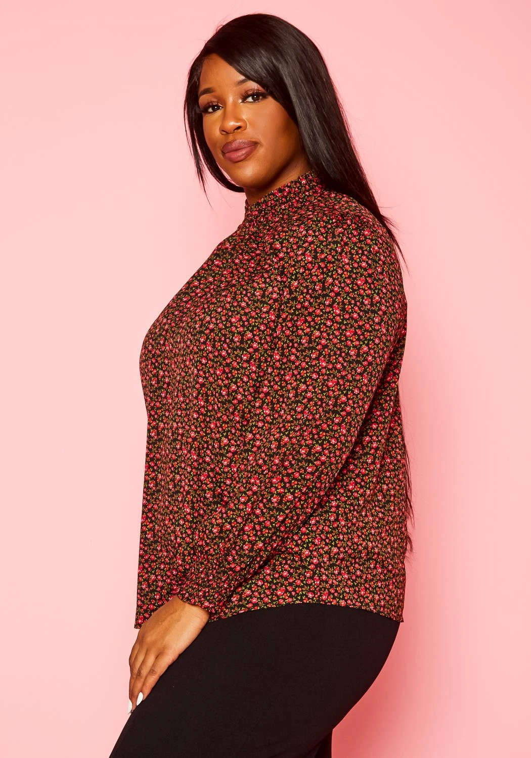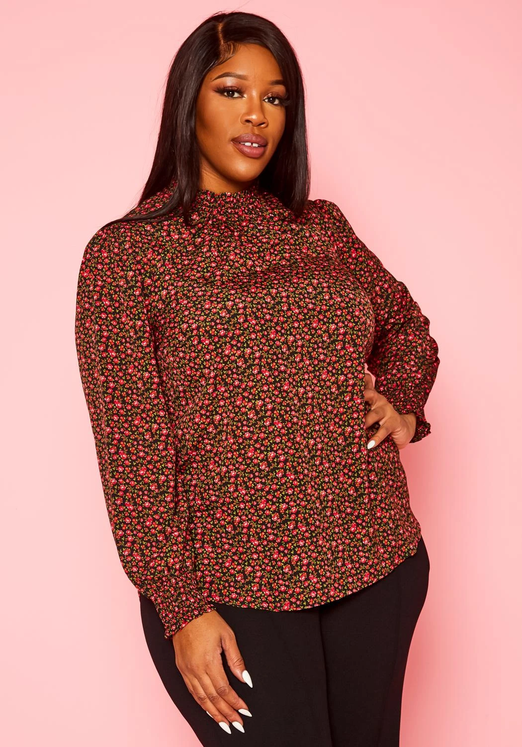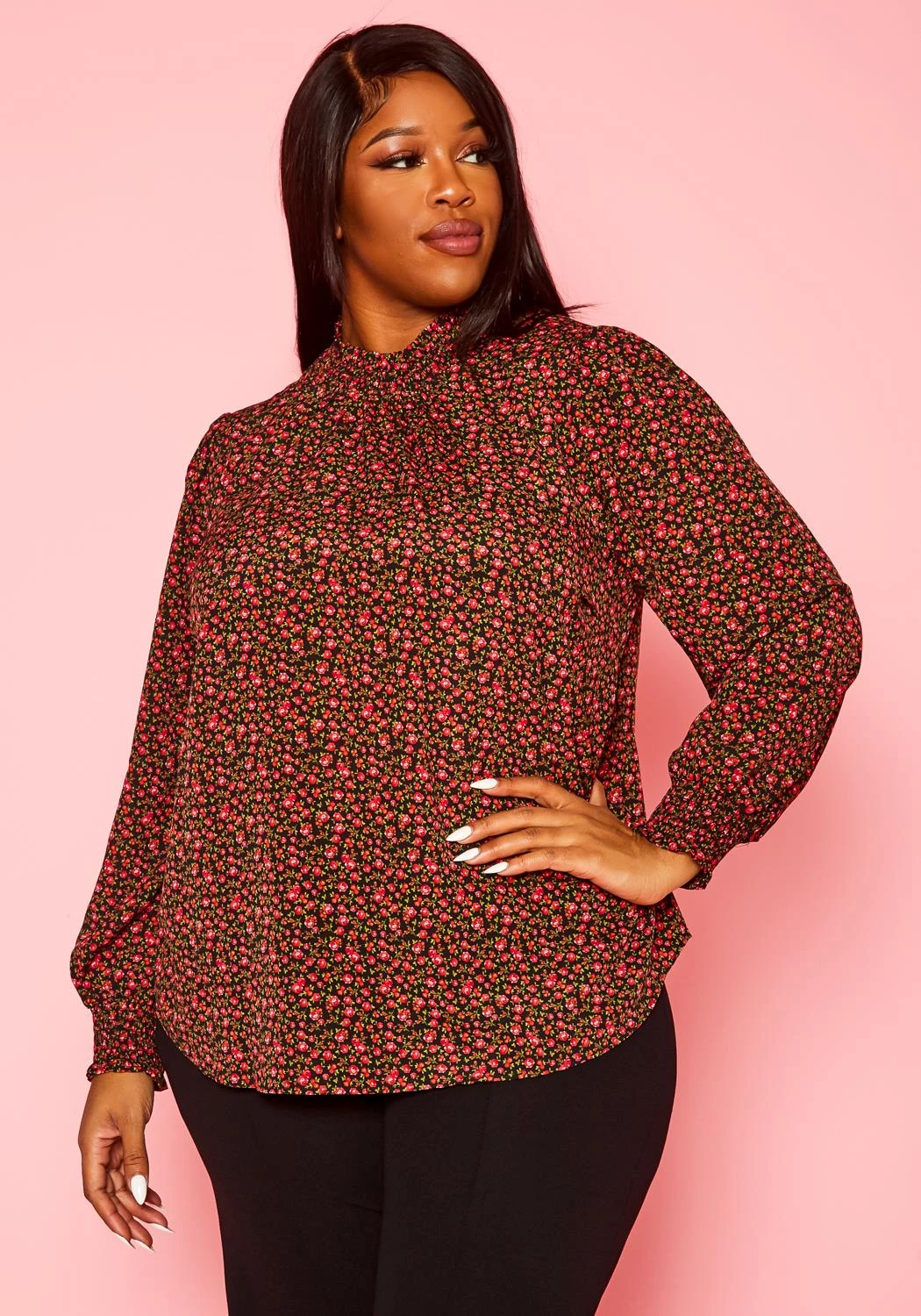 Lovely plus size women’s long sleeve blouse in rose floral pattern, smocked high neckline, smocked wrist cuffs and back button closure.