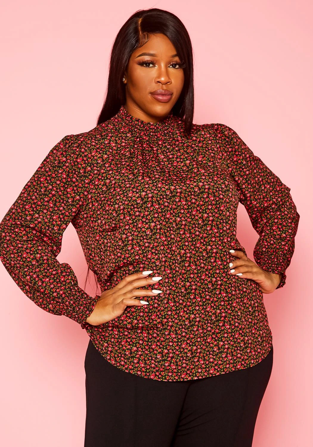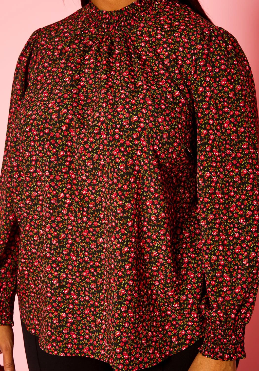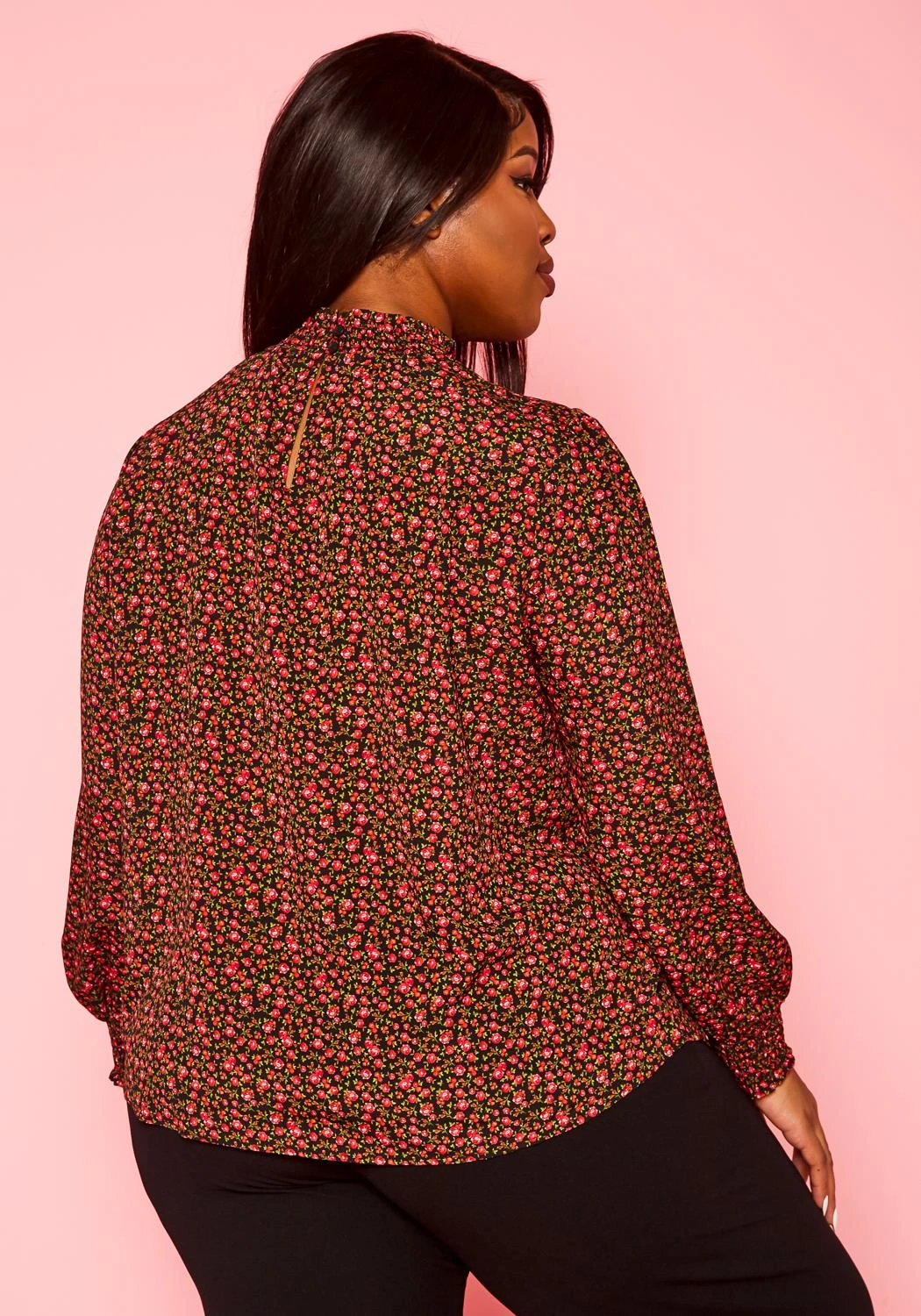Lovely plus size women’s long sleeve blouse in rose floral pattern, smocked high neckline, smocked wrist cuffs and back button closure.