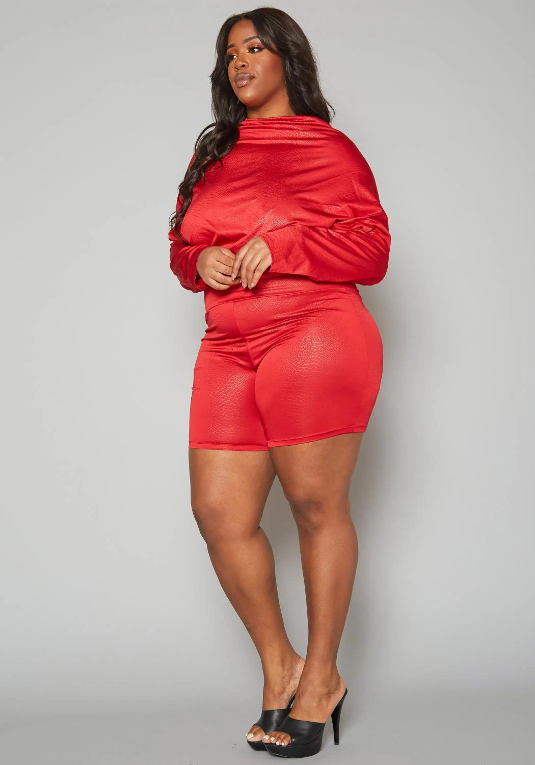 Romantic plus size women’s romper in dolman long sleeve design, open back style, high neck and shimmery material.
