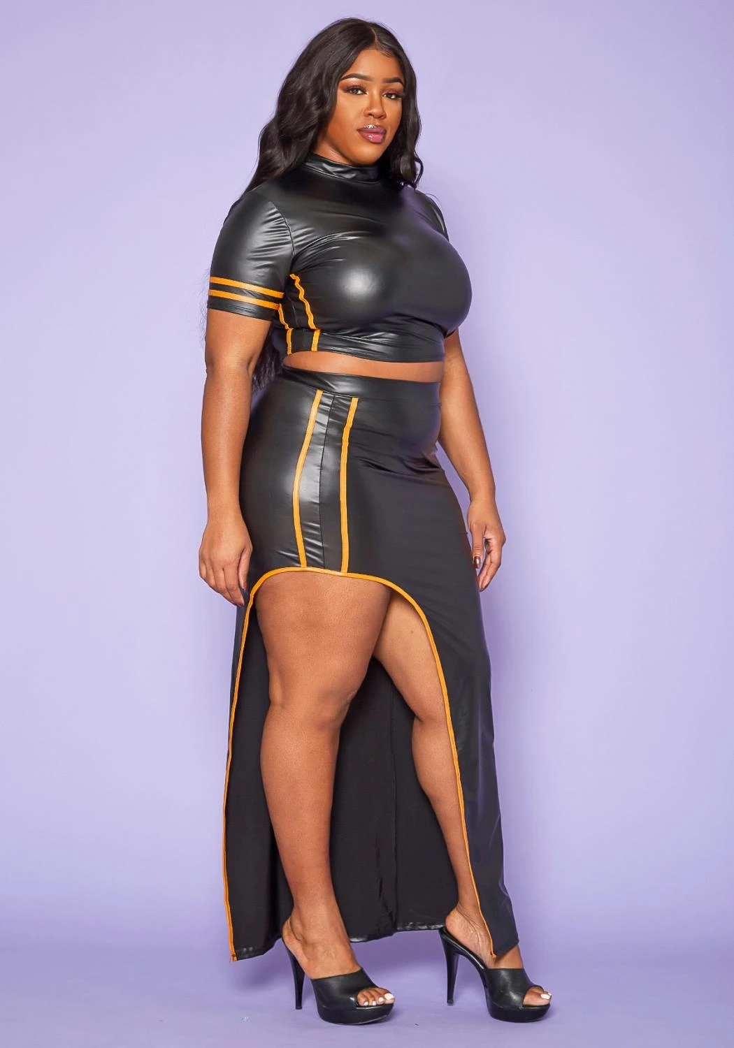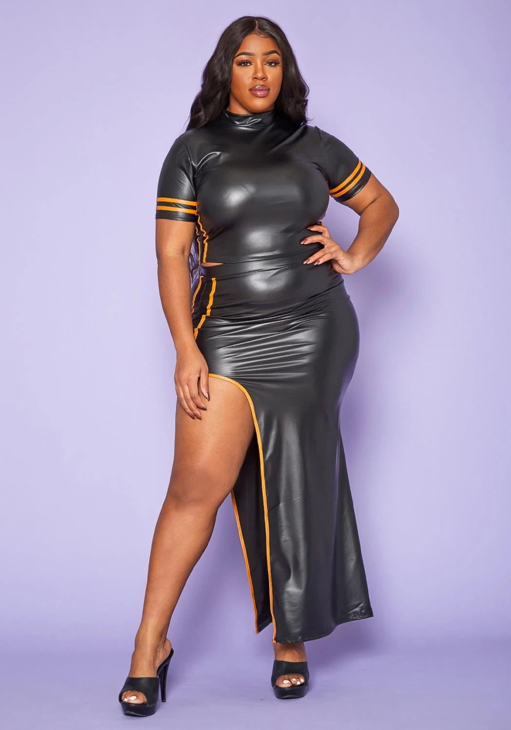 Plus size women’s skirt in faux leather style, featuring a mock neck crop top with striped trim short sleeve detail & high-waisted side slit maxi skirt with striped trim detail.