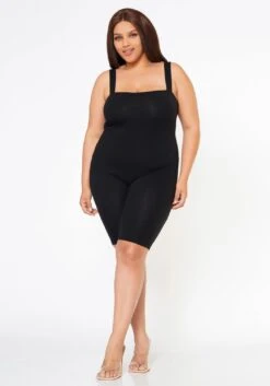 Plus size women’s romper, featuring tiered detail, v-neck hem, long cuff hem sleeves, back criss cross tie-up design & zipper closure.