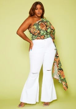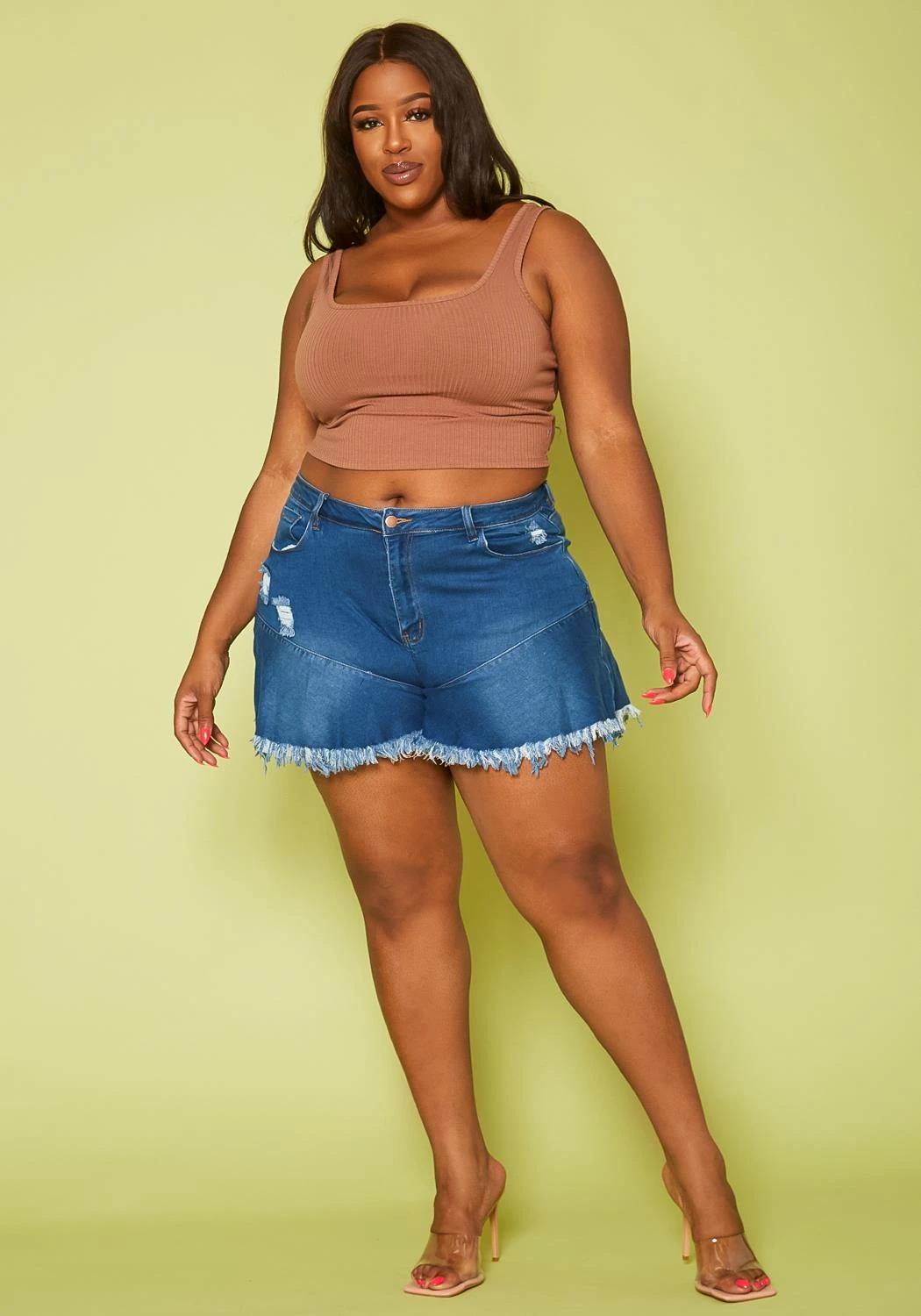 Plus size women’s shorts in denim style, featuring a fit and flare style, distressed hem with fringe detail, front pockets & front button/zipper closure.