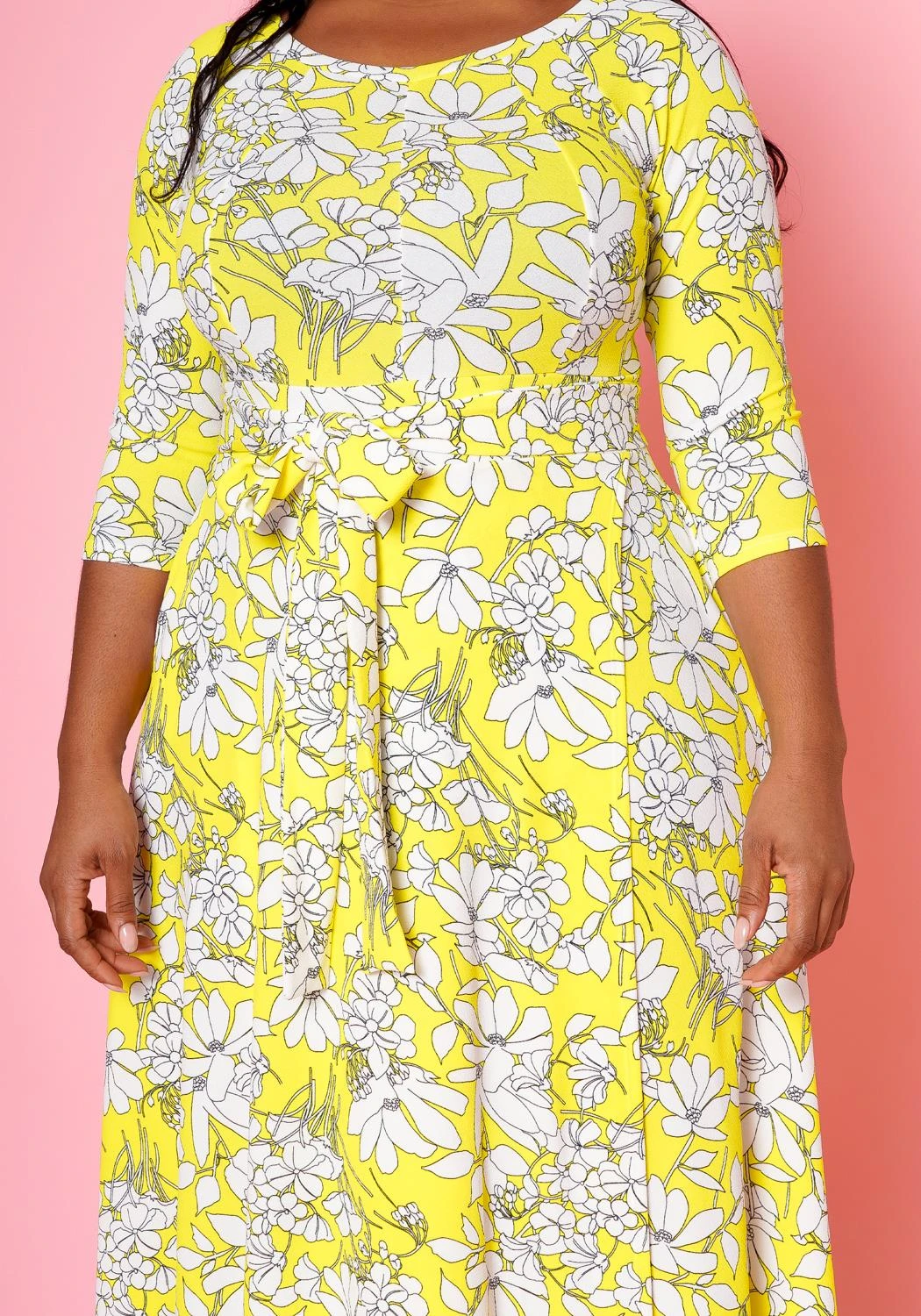Plus size women’s dress in maxi style, featuring a front wrap hem, round neck hem, 3/4 sleeves, side pockets & waist detachable tie-up belt detail.