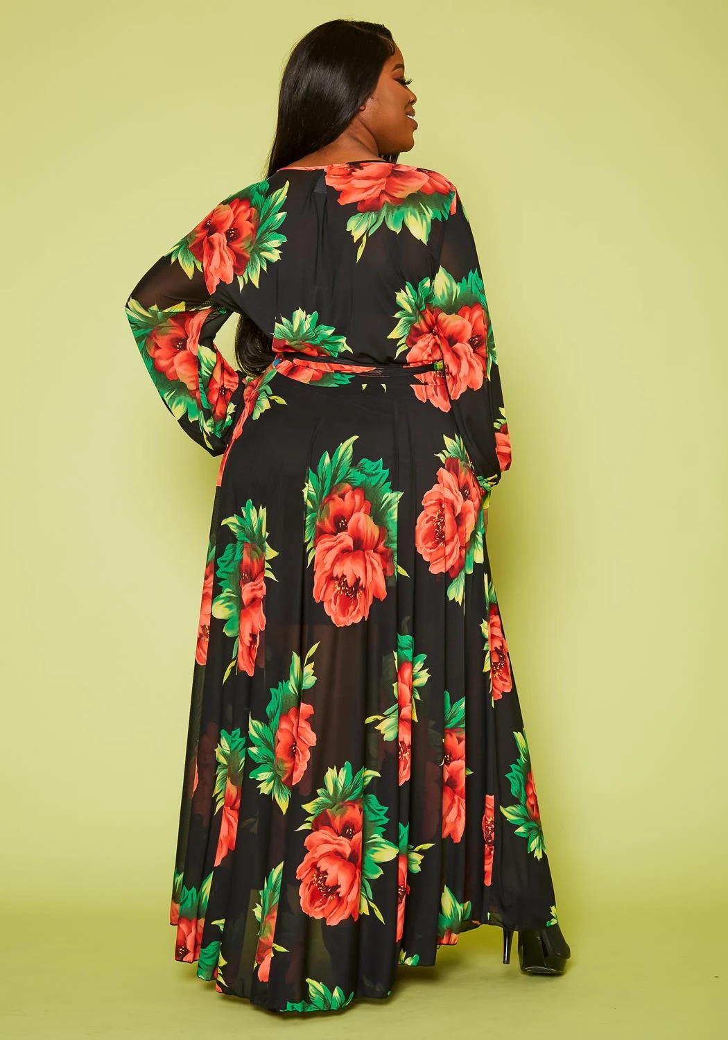 Plus size women’s dress in fit & flare style, featuring a front v-neck, long sleeve cuff hem with button details and waist tie ascent.