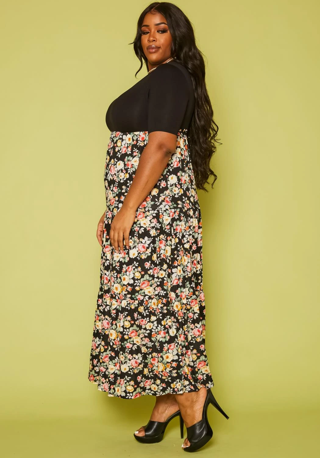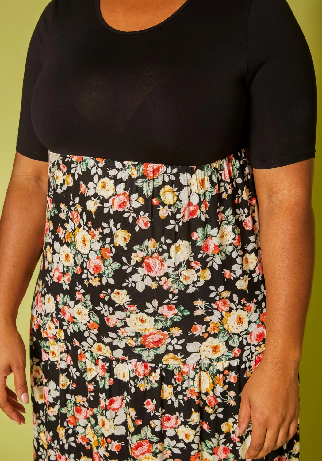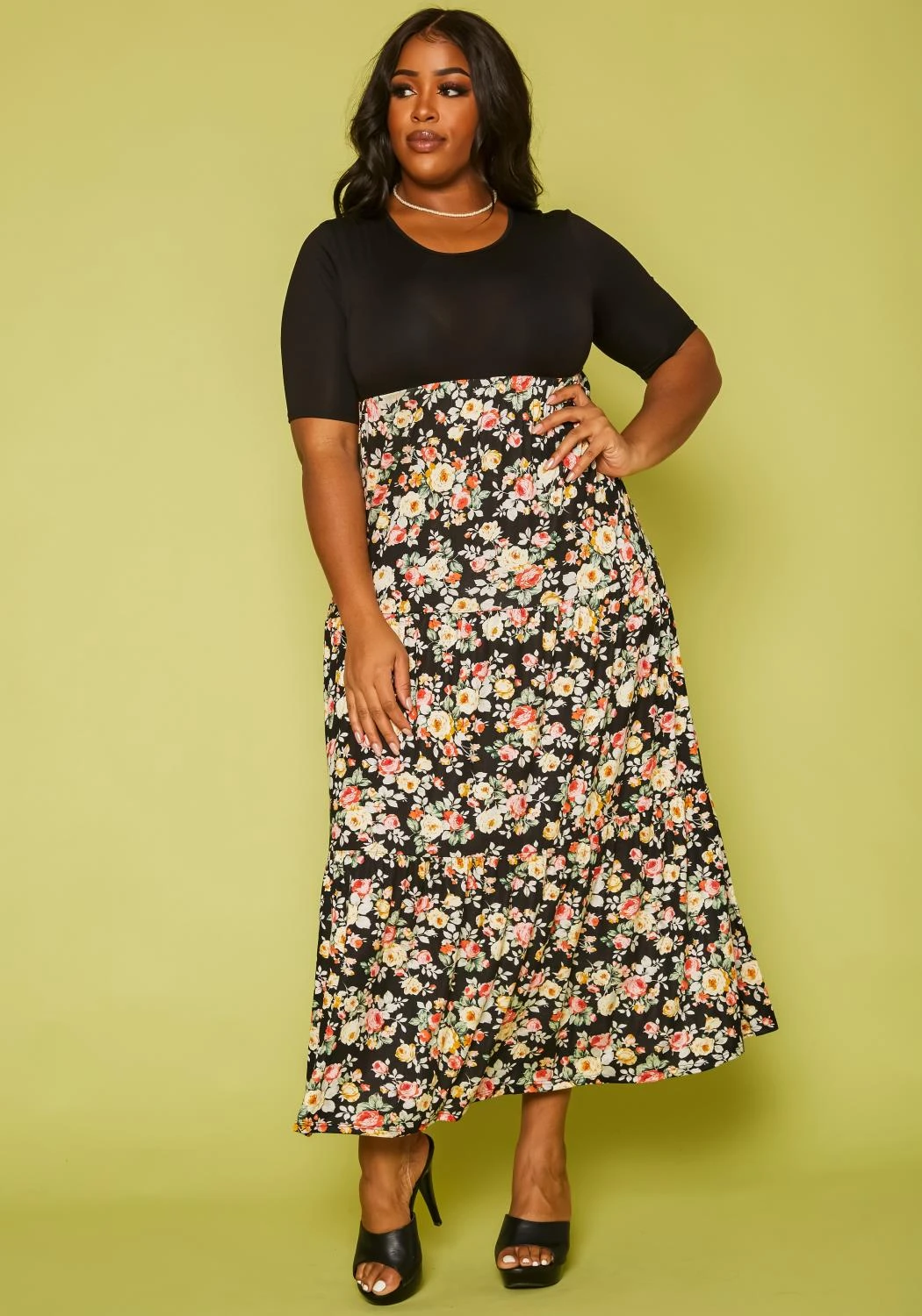 Effortless plus size women’s maxi dress in floral pattern, round neck style, short sleeves and fit to flare design.