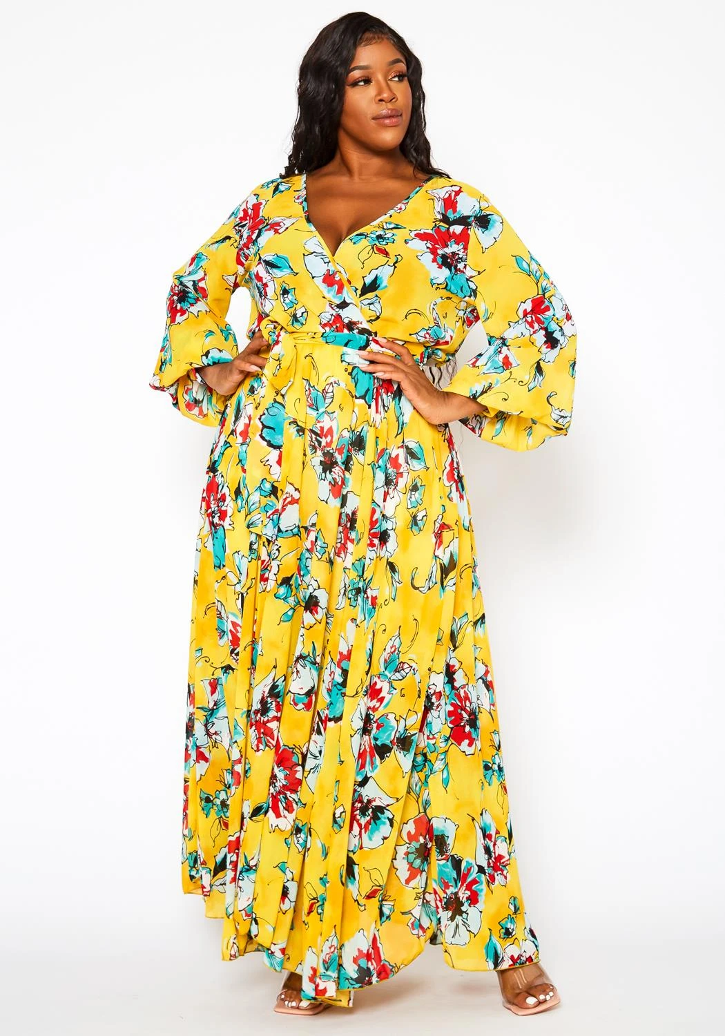 Absolute gorgeous plus size women’s maxi dress in floral pattern, v-neck style, long sleeves, fitted wrist cuffs and waist tie ascent.