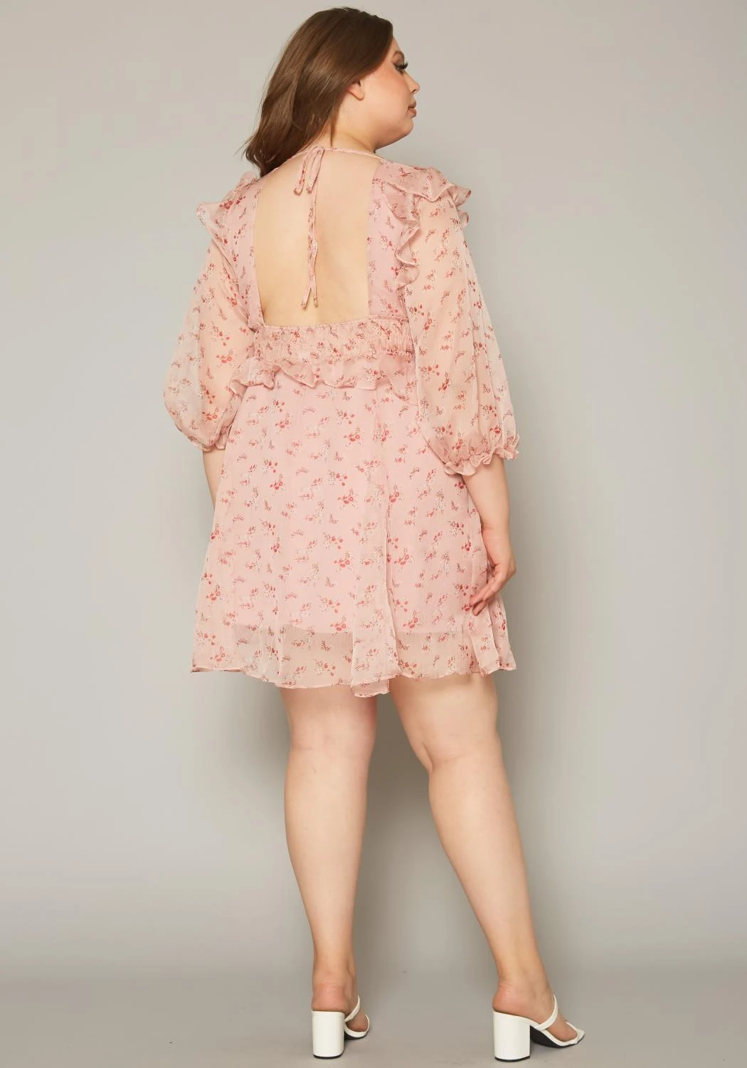 Plus size women’s mini dress in floral pattern, v-neck style, open back design, 3/4 long sleeves, ruffle trim details and chiffon style.