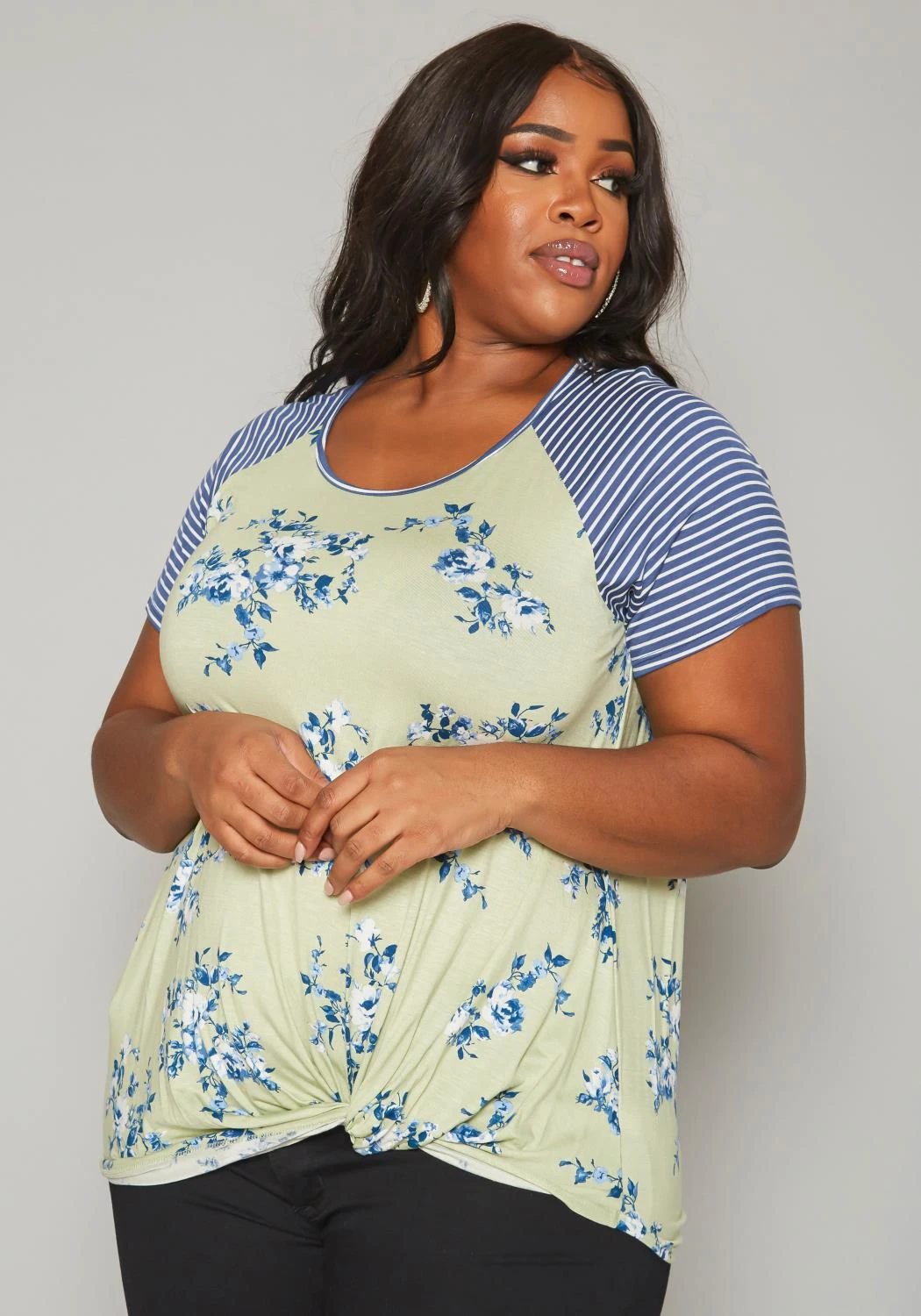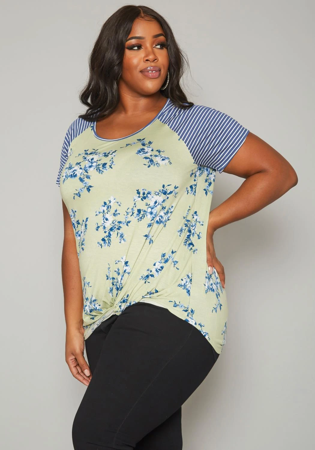 Casual plus size women’s t-shirt in multi striped-floral pattern, short sleeves, twist hem detail and relaxed fitting.