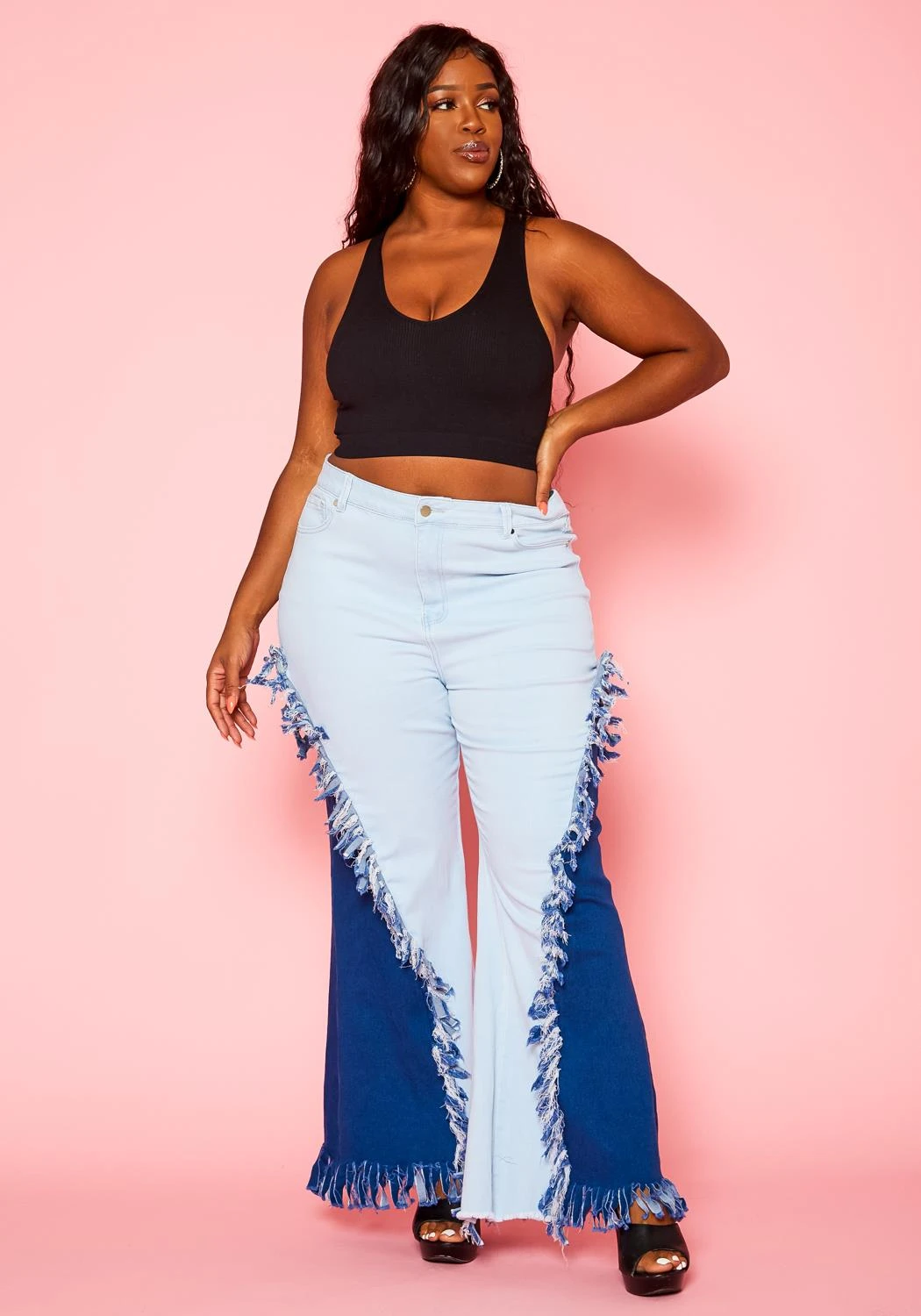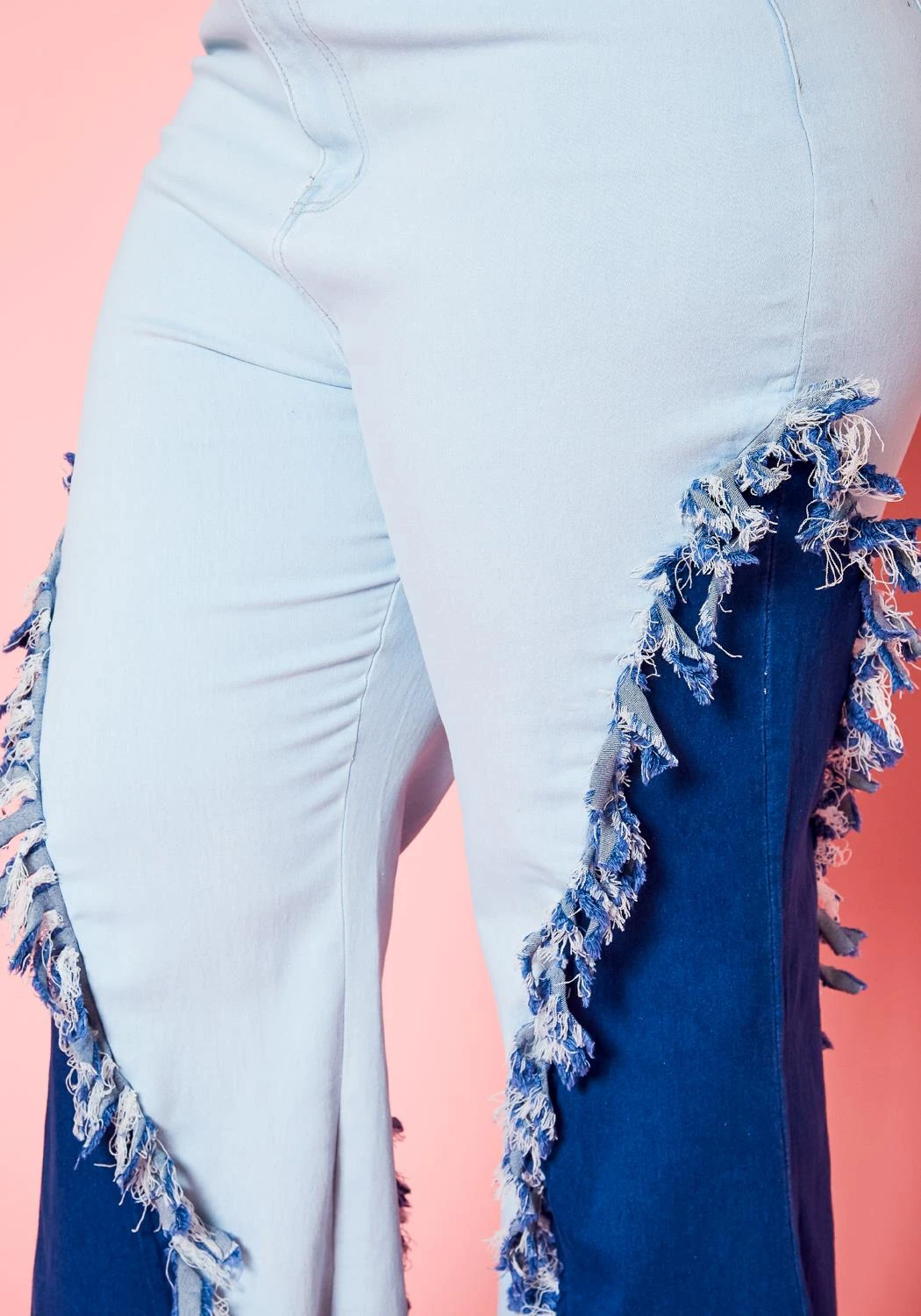 Stylish plus size women’s denim jeans with fringe hem details, multi color block design and flared leg style.