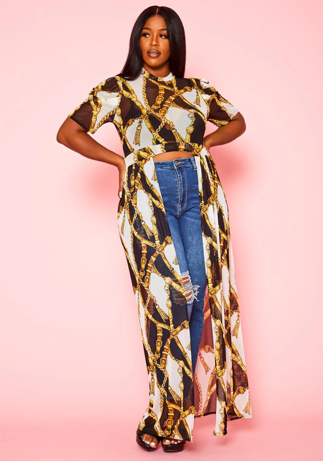 Stylish plus size women’s top in multi print, high to low design, chiffon flare, high neck style and short sleeves. Contains back zipper closure.