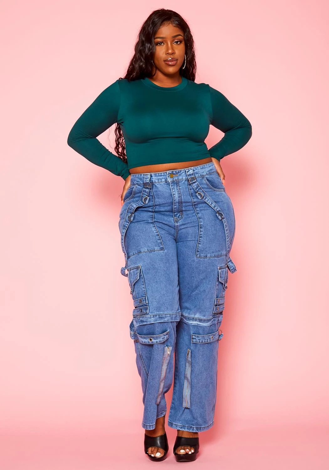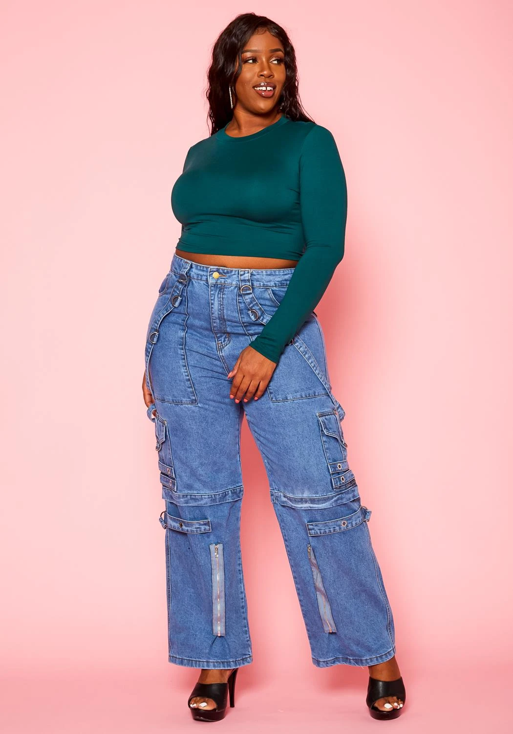 Trendy cargo denim jeans for plus size women in high waist style, straight leg fit, multi pocket hem and lanyard ascents.