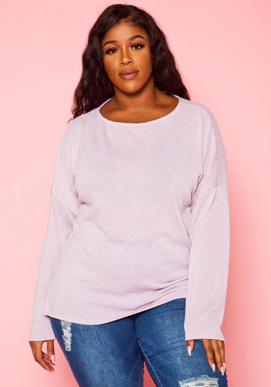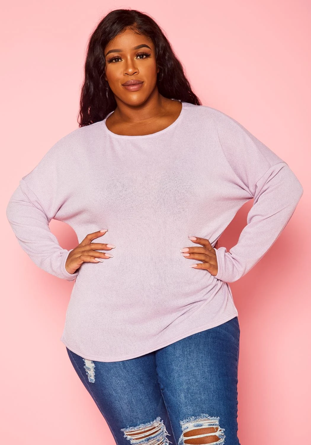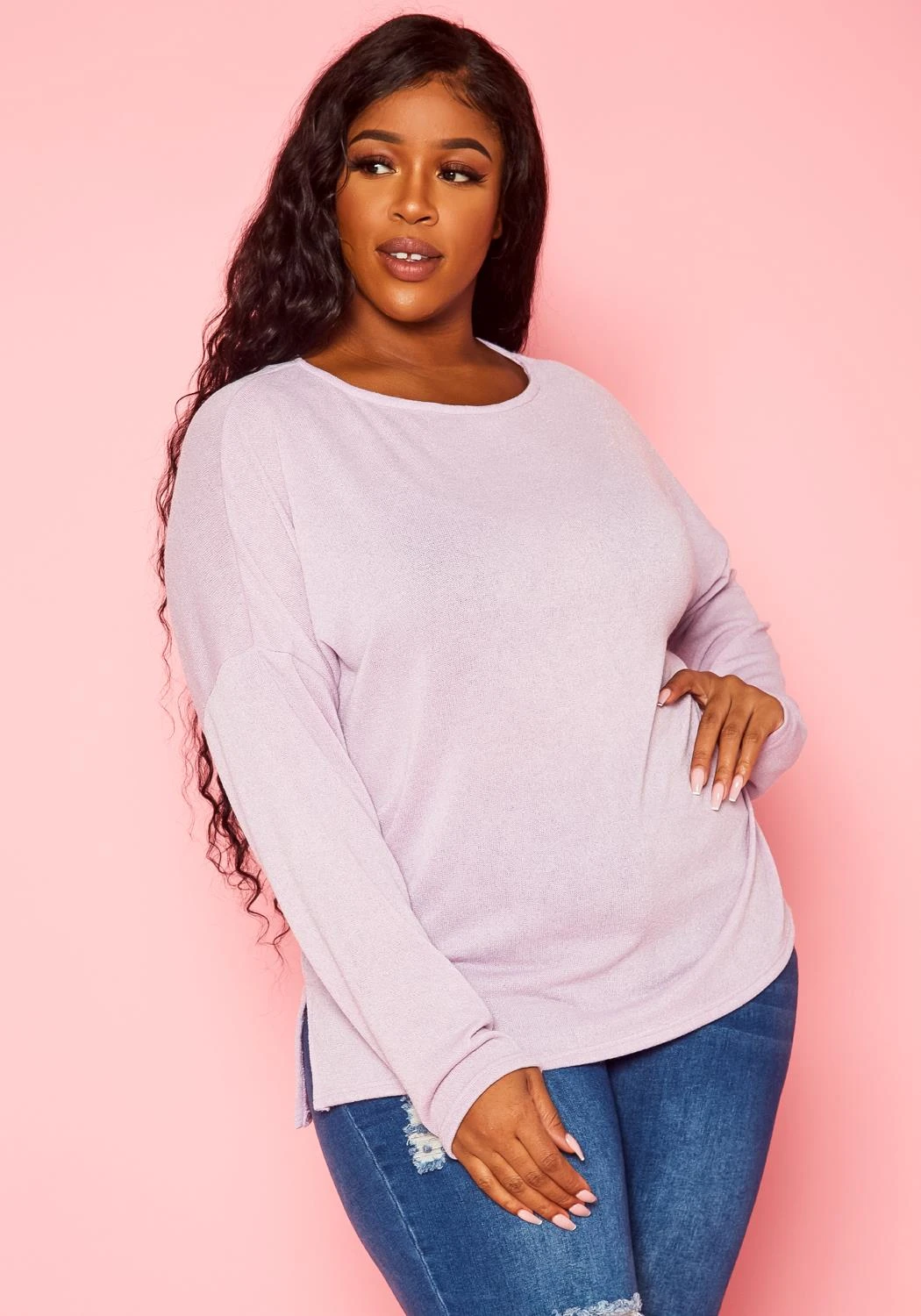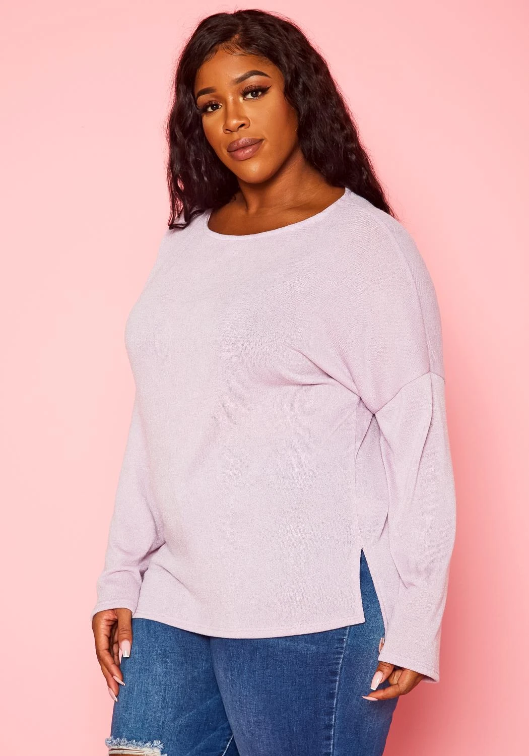 Plus size women’s long sleeve top in light knit material and side slit hem detail.