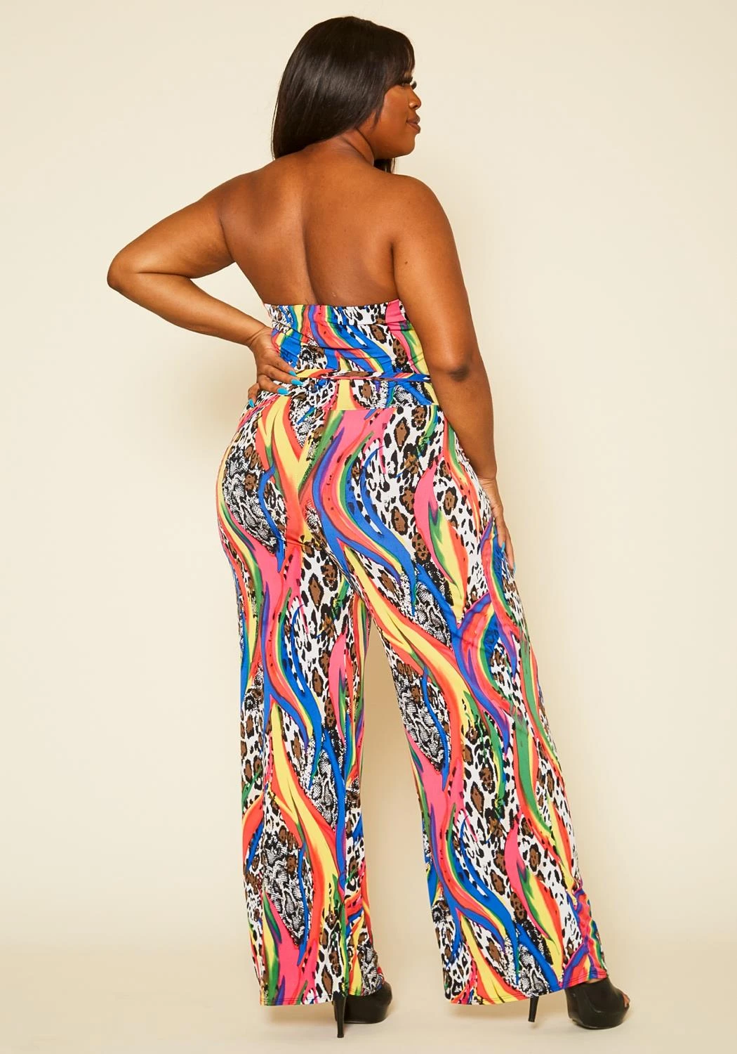 One of a kind plus size women’s jumpsuit with leopard pattern, colorful print mix, belted waist tie, flare leg hem and tube fitting.