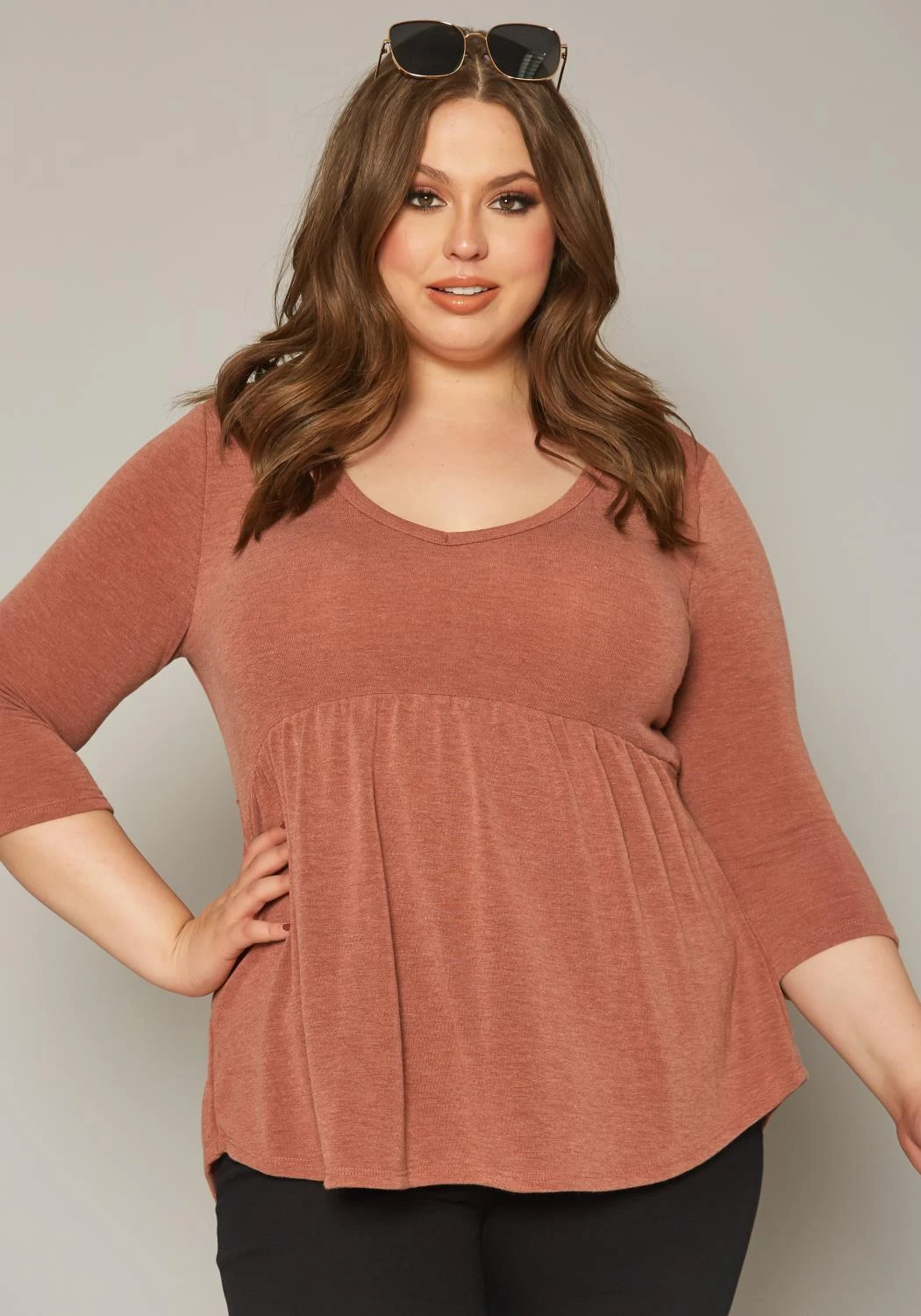 Casual plus size women’s shirt in round neck style, flare design and 3/4 long sleeves.