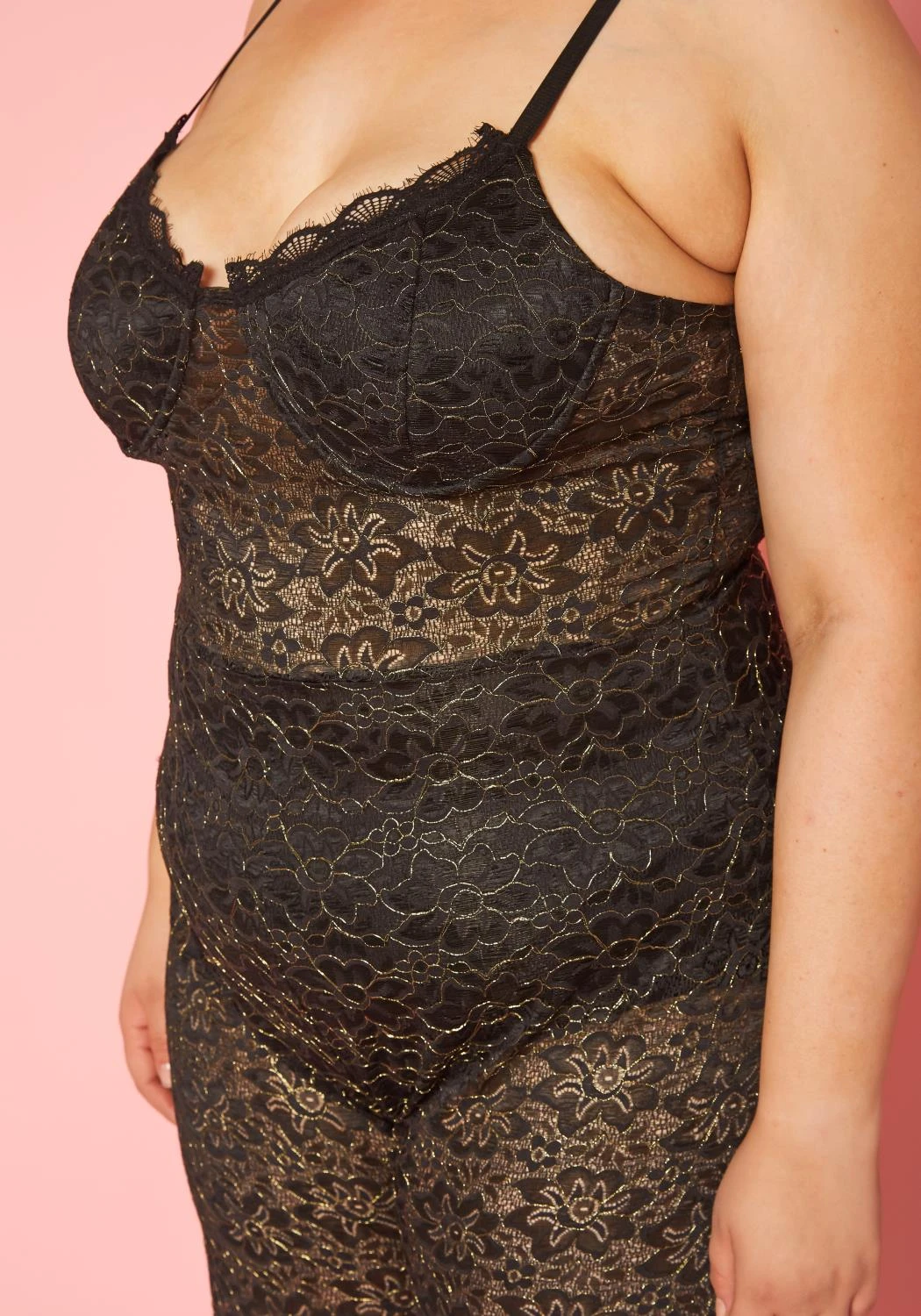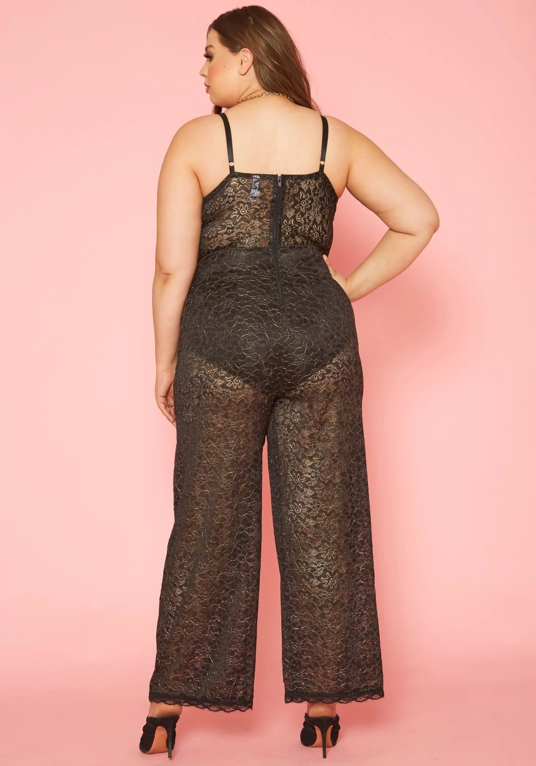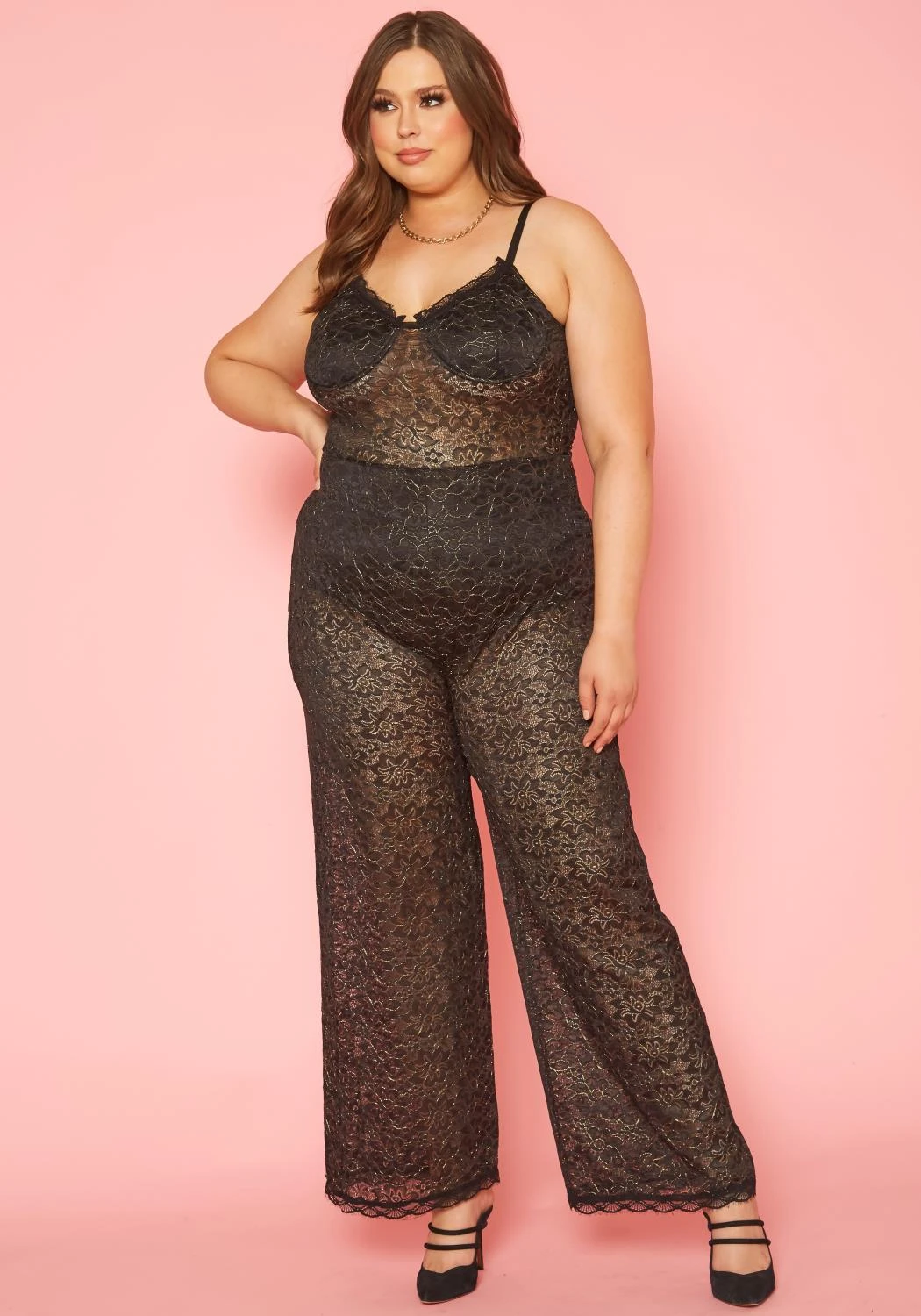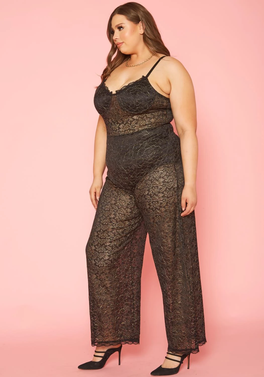 Gorgeous plus size women’s jumpsuit in metallic floral lace design, v-neck style, cami shoulder straps and flare leg hem.