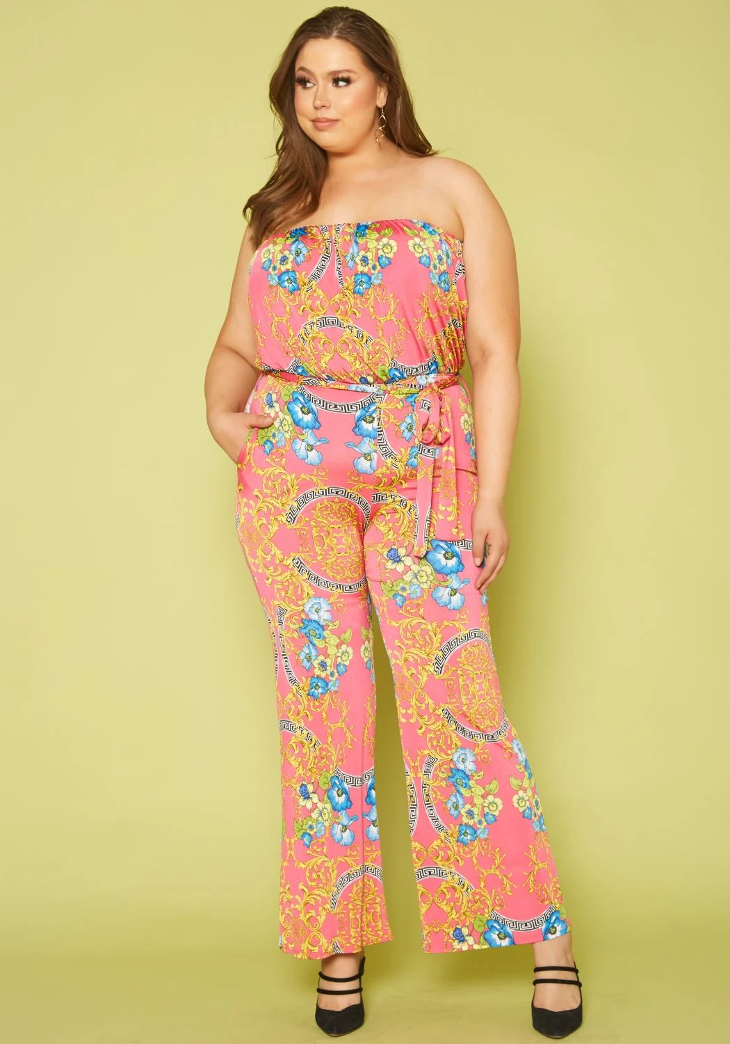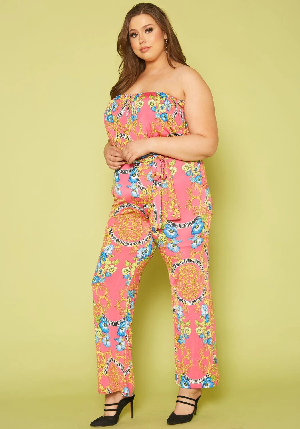 Plus size women’s tube jumpsuit with elastic waist, flare leg hem and vivid floral prints.