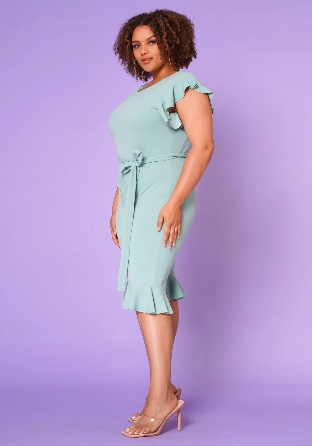 Plus size woman’s biker romper with ruffle detailing a round neck and waist tie accent.