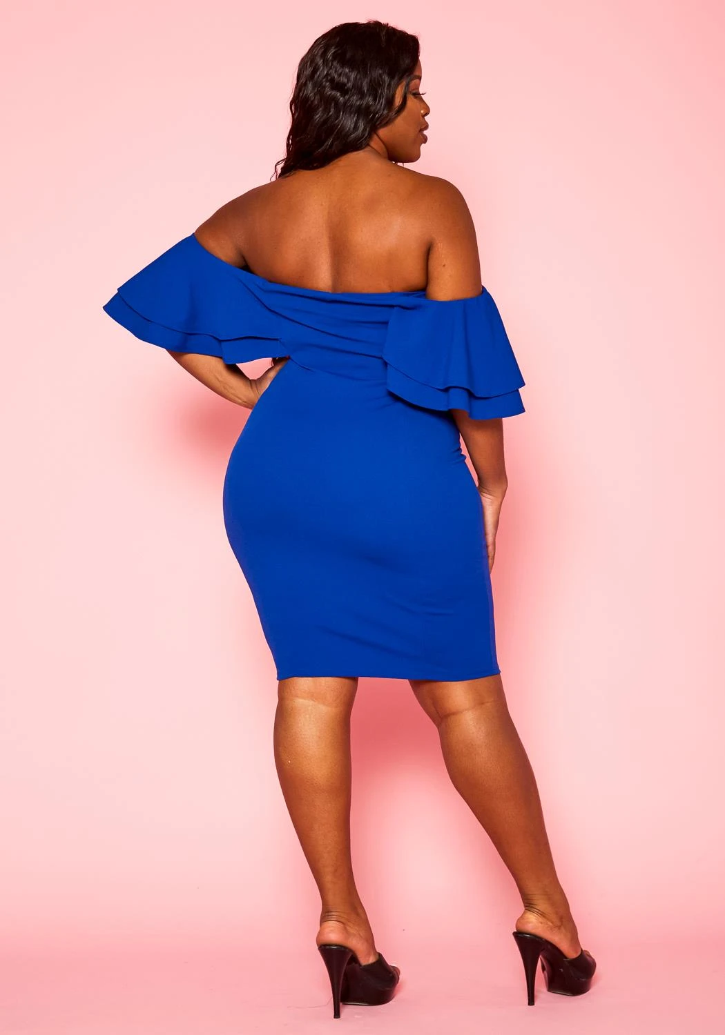 Gorgeous plus size women’s mini dress in off shoulder style and ruffle hem short sleeves.