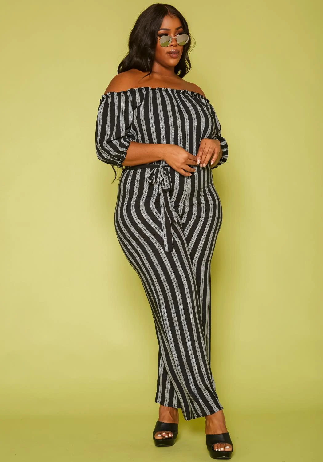 Plus size women’s lovely jumpsuit in striped pattern, off shoulder design, short sleeves, flare leg hem and belted waistline.