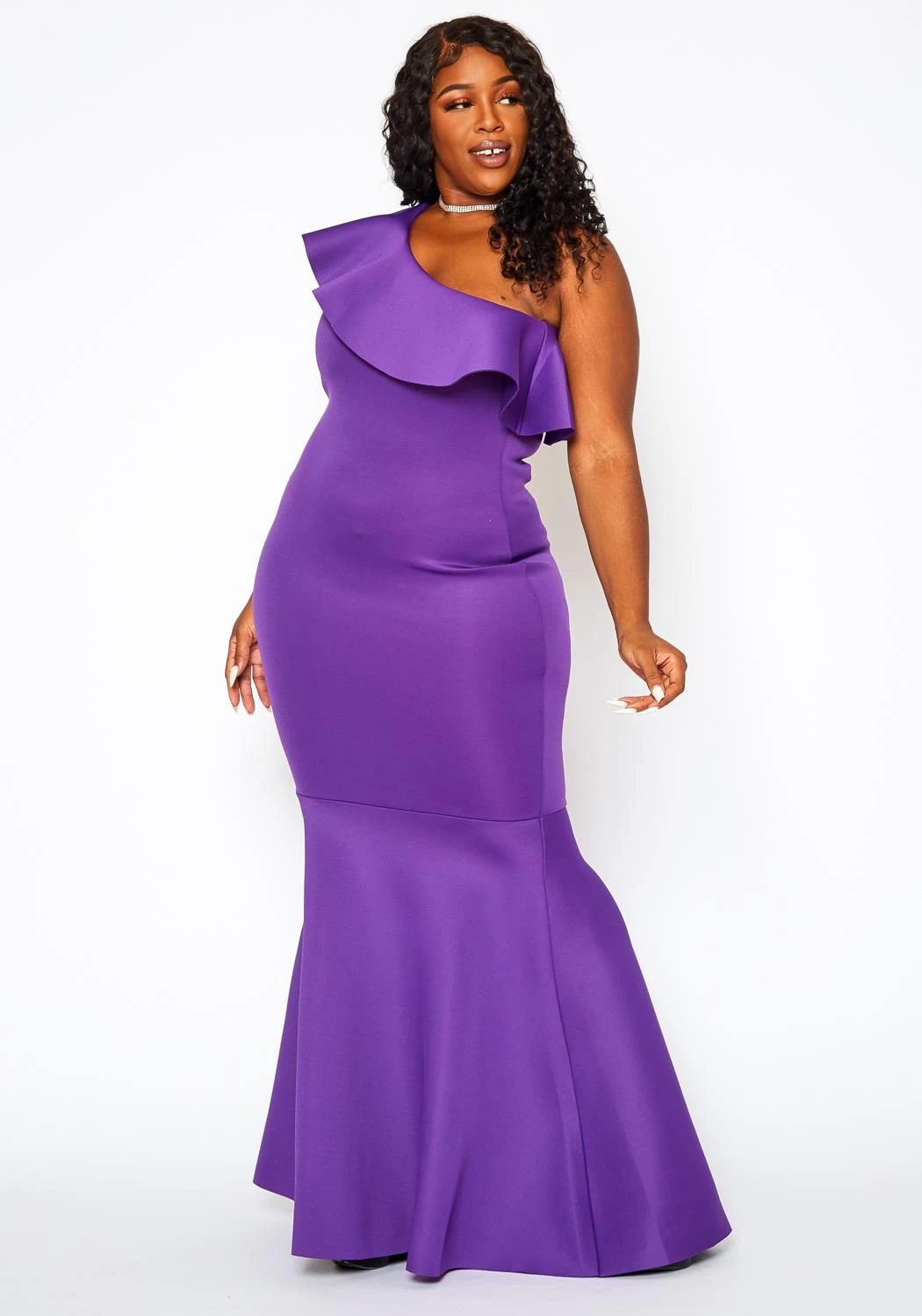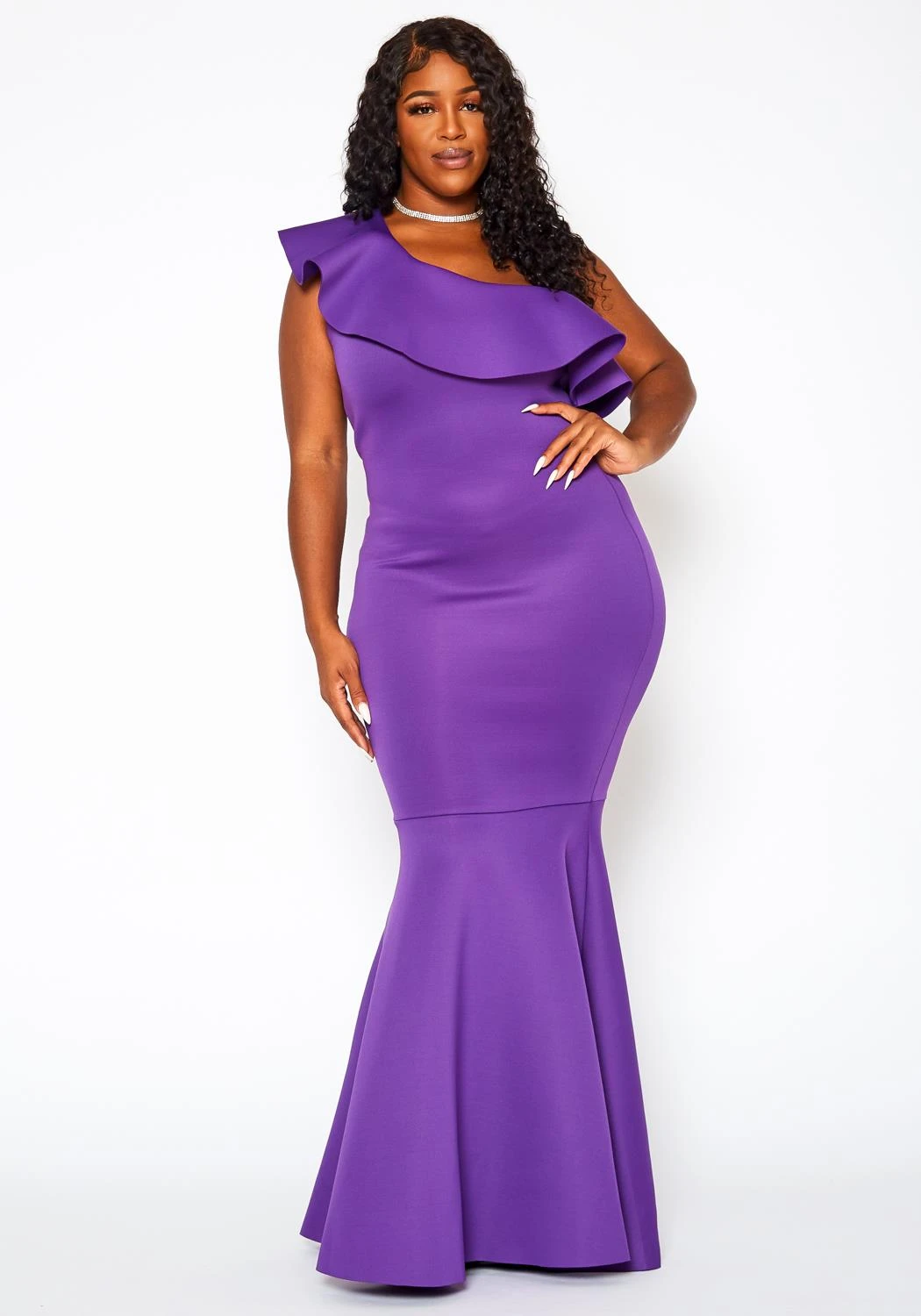 Dress to impress in our perfect special occasion plus size women’s maxi gown! Features one shoulder ruffle hem and a sleeveless style.