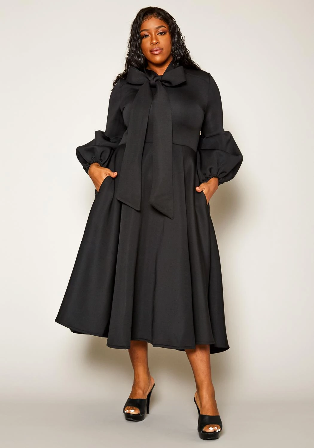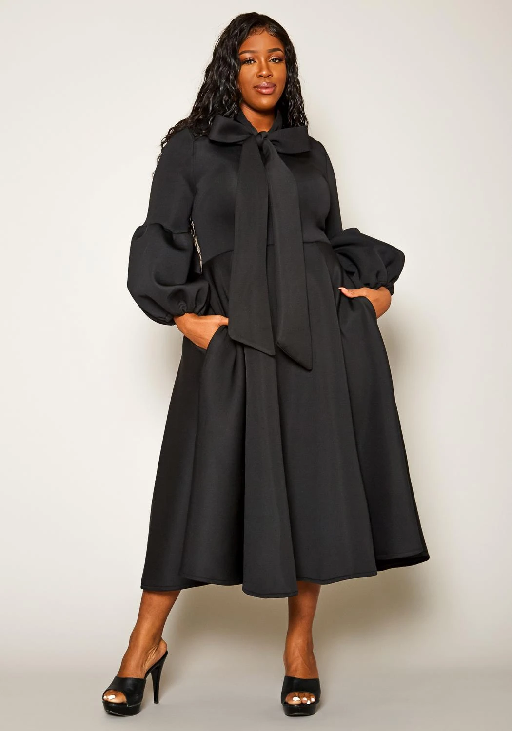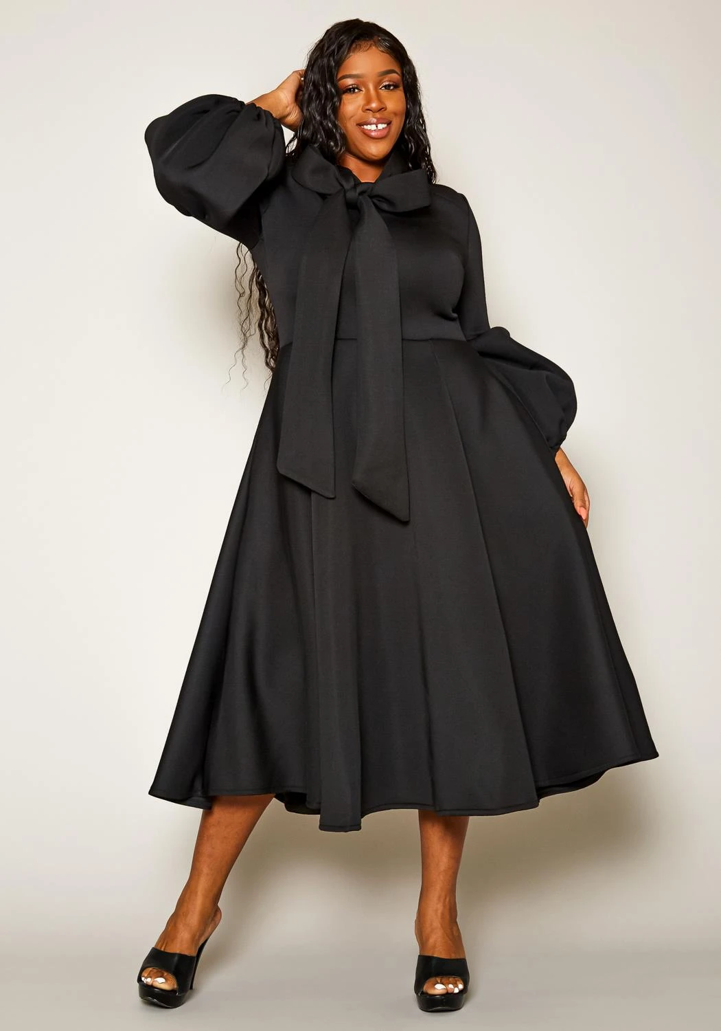 Take your fashion to the extremes! An unordinary plus size womens midi dress in fit & flare style. Features unique puffed sleeves and thick collar bow/drape features that create such an extravagant look! Contains back zipper closure.
