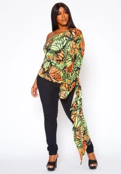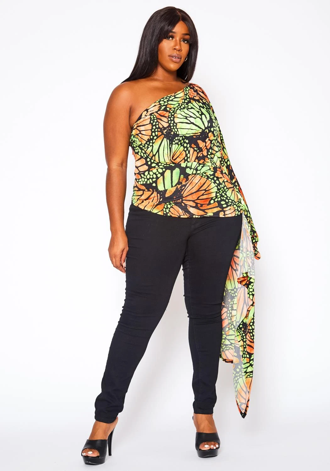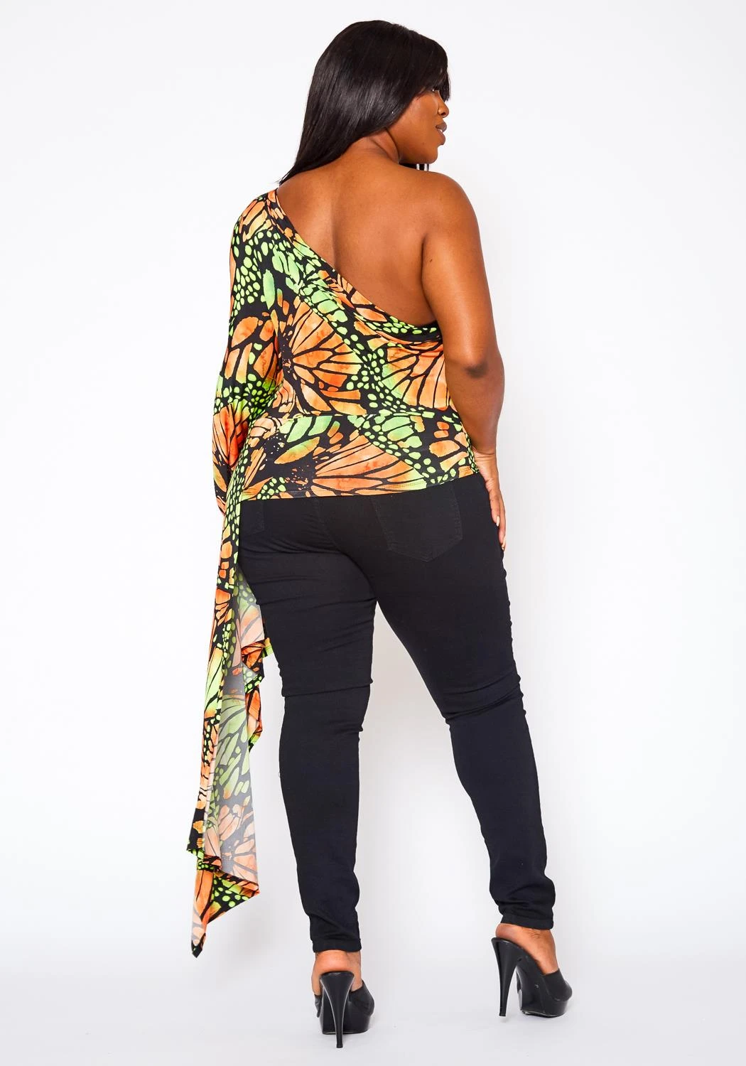 One of a kind plus size women’s blouse in one sleeve design, drape hem detail and fitted hem.