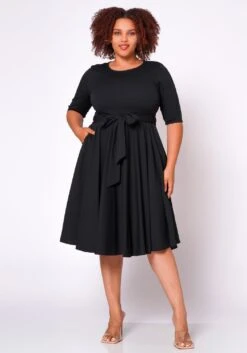 Plus size women’s gorgeous mini dress in fit to flare design, v-neck style, puffy short sleeves and pocket hem.