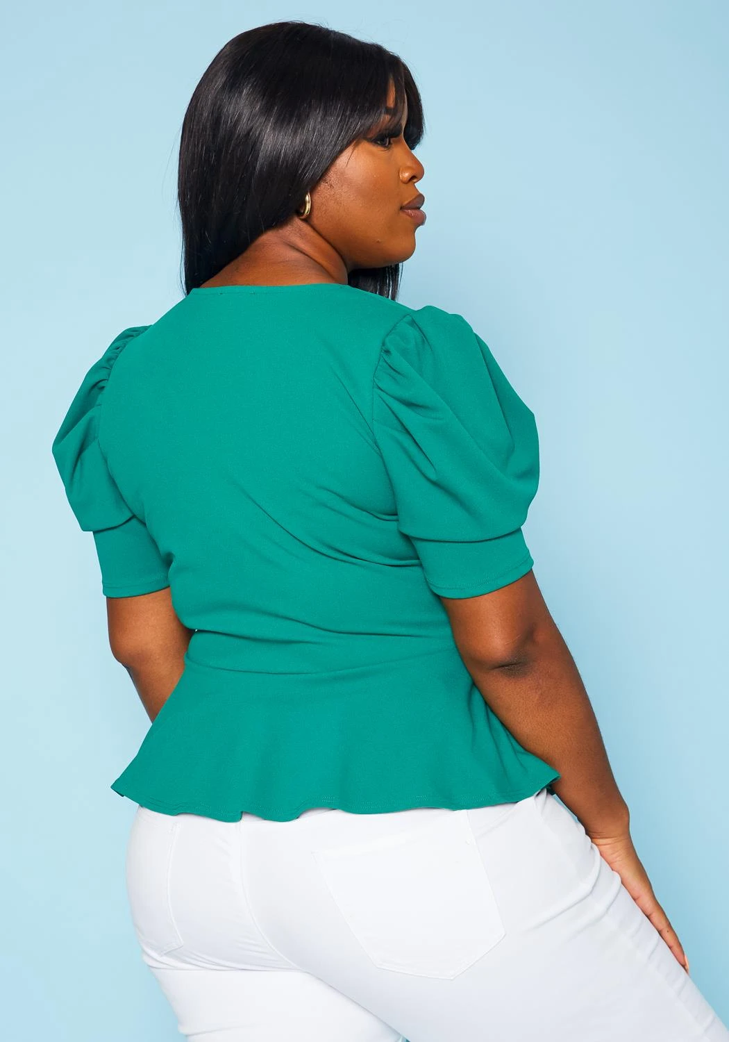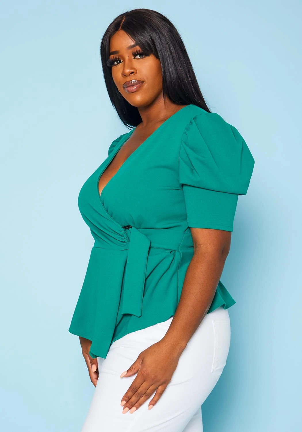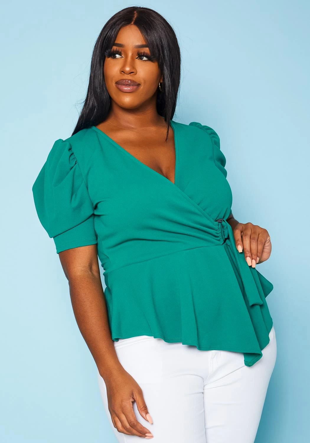 Plus size women’s blouse in peplum style, featuring a surplice hem, short puff sleeves & undetachable D-ring adjustable belt.